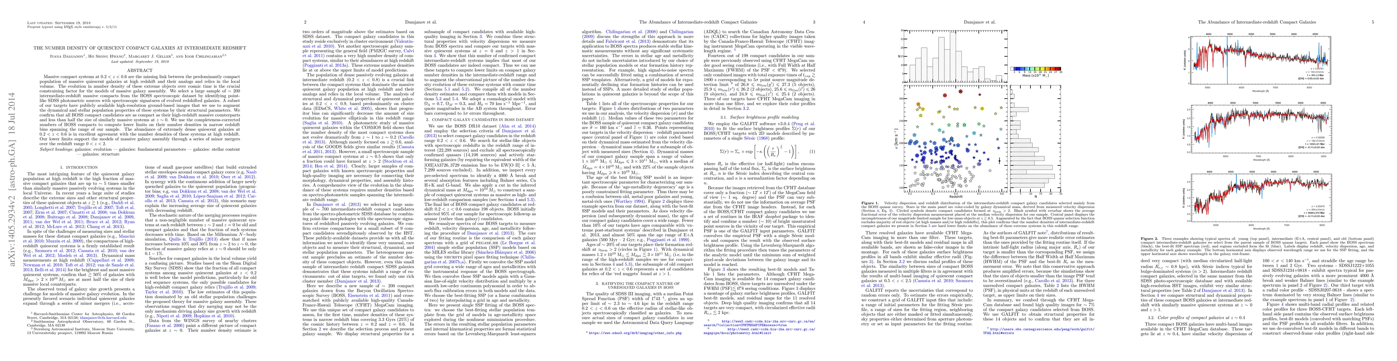 This study investigates the number density of massive, quiescent compact galaxies at intermediate redshifts (0.2<z<0.6), finding they bridge the gap between high-redshift compact galaxies and their local analogs. The research confirms these galaxies' compactness and supports models of galaxy assembly via minor mergers.