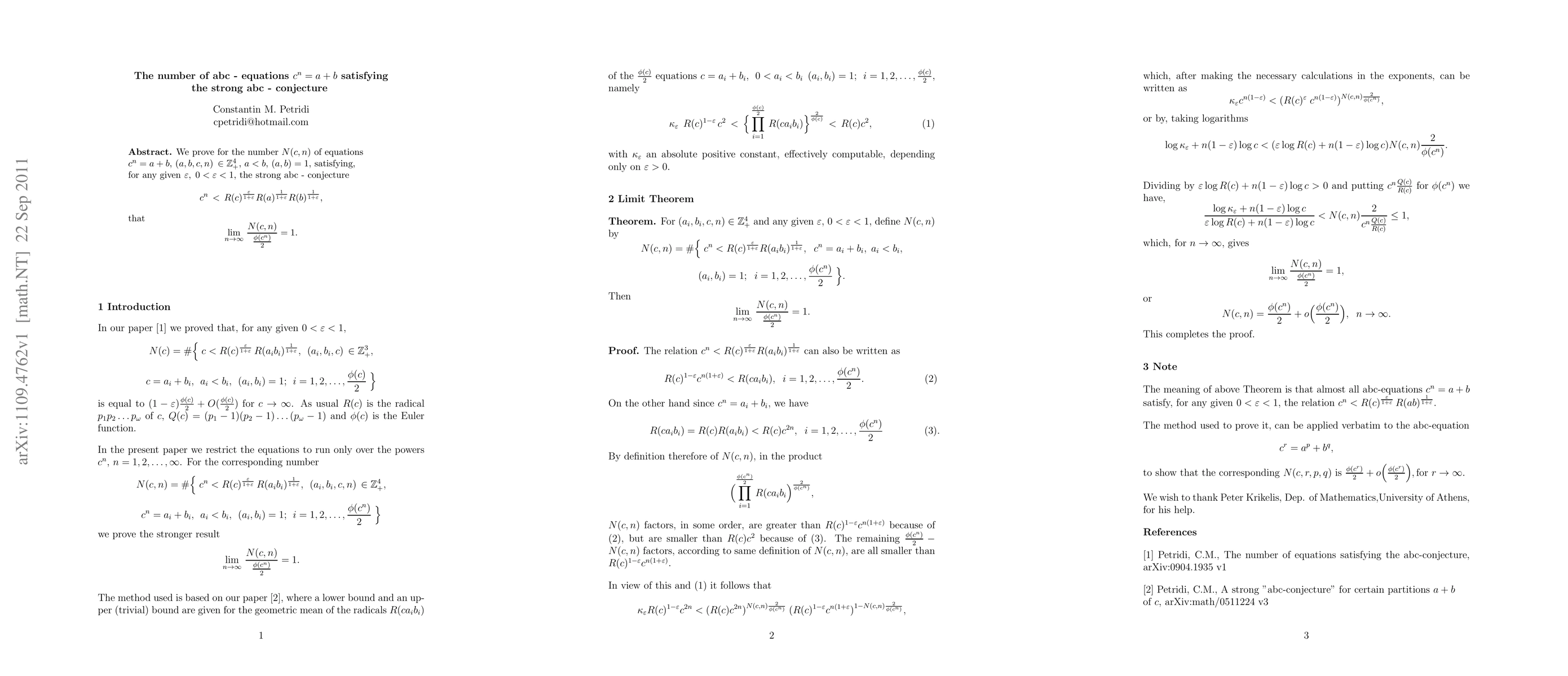 This paper proves that the frequency of abc equations of the form c^n = a+b that satisfy the strong abc-conjecture approaches phi(c^n)/2 + o(phi(c^n)/2) as n tends to infinity. The result provides insight into the distribution of solutions under the strong abc-conjecture.