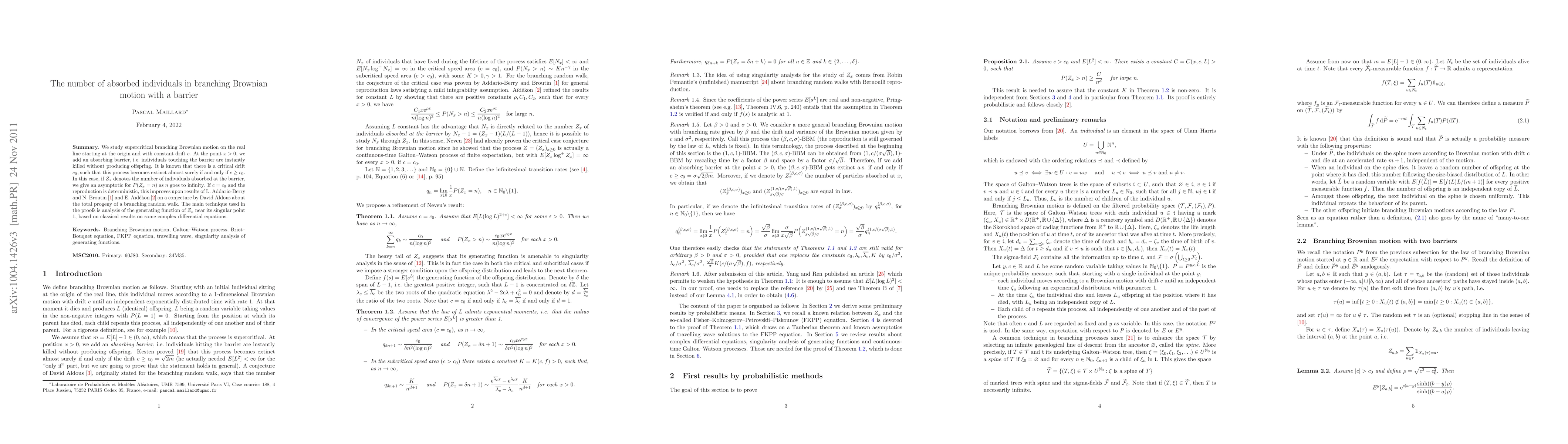 This research paper studies branching Brownian motion with an absorbing barrier, finding an asymptotic for the probability of a specific number of individuals being absorbed as the population size approaches infinity. It improves upon existing results in understanding the total progeny of a branching random walk.