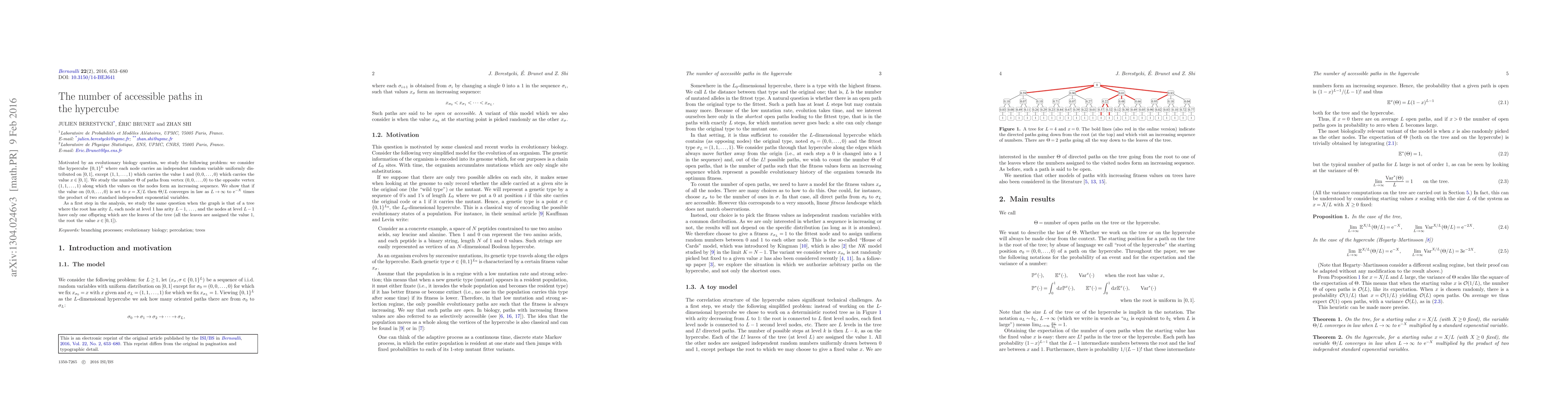 Motivated by an evolutionary biology question, we study the following problem: we consider the hypercube $\{0,1\}^L$ where each node carries an independent random variable uniformly distributed on $[0,1]$, except $(1,1,\ldots,1)$ which carries the value $1$ and $(0,0,\ldots,0)$ which carries the value $x\in[0,1]$. We study the number $\Theta$ of paths from vertex $(0,0,\ldots,0)$ to the opposite vertex $(1,1,\ldots,1)$ along which the values on the nodes form an increasing sequence. We show that if the value on $(0,0,\ldots,0)$ is set to $x=X/L$ then $\Theta/L$ converges in law as $L\to\infty$ to $\mathrm{e}^{-X}$ times the product of two standard independent exponential variables. As a first step in the analysis, we study the same question when the graph is that of a tree where the root has arity $L$, each node at level 1 has arity $L-1$, \ldots, and the nodes at level $L-1$ have only one offspring which are the leaves of the tree (all the leaves are assigned the value 1, the root the value $x\in[0,1]$).