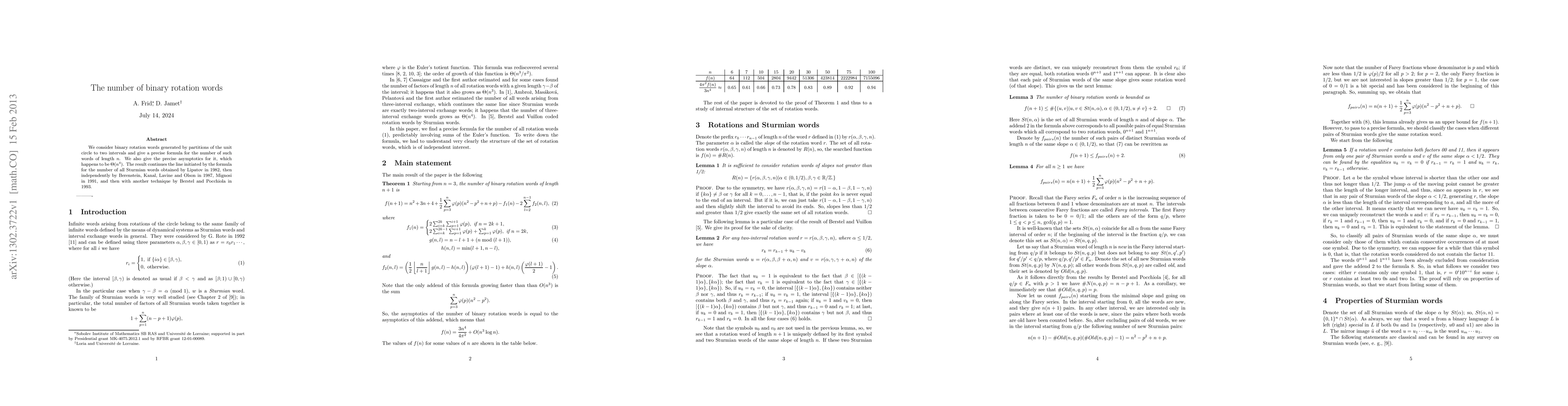 We consider binary rotation words generated by partitions of the unit circle to two intervals and give a precise formula for the number of such words of length n. We also give the precise asymptotics for it, which happens to be O(n^4). The result continues the line initiated by the formula for the number of all Sturmian words obtained by Lipatov in 1982, then independently by Berenstein, Kanal, Lavine and Olson in 1987, Mignosi in 1991, and then with another technique by Berstel and Pocchiola in 1993.