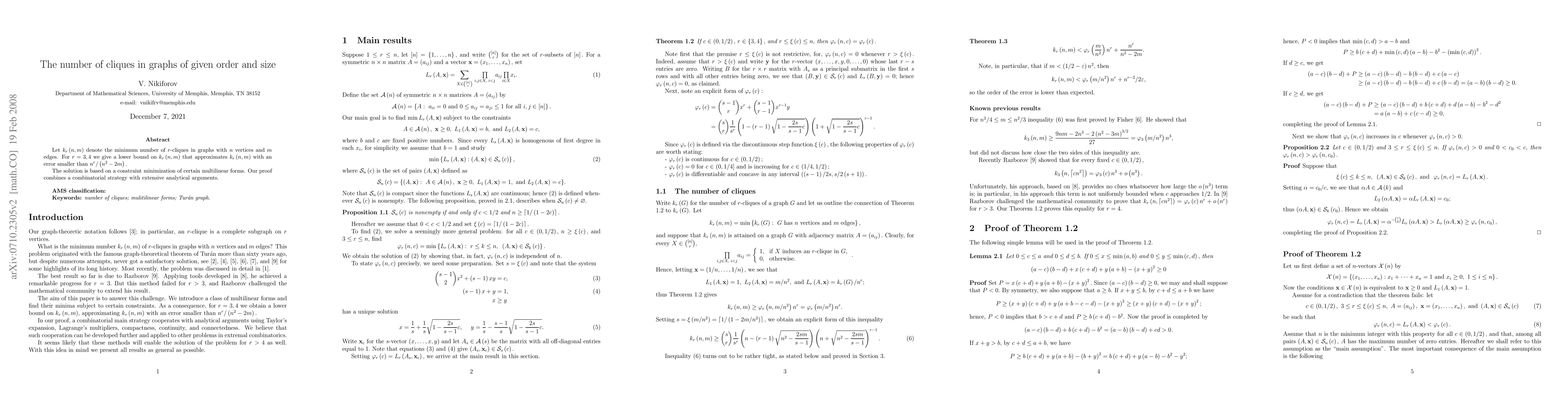 Researchers provide a lower bound for the minimum number of r-cliques in graphs with n vertices and m edges, approximating it with an error smaller than n^r/(n^2-2m) for r=3,4.