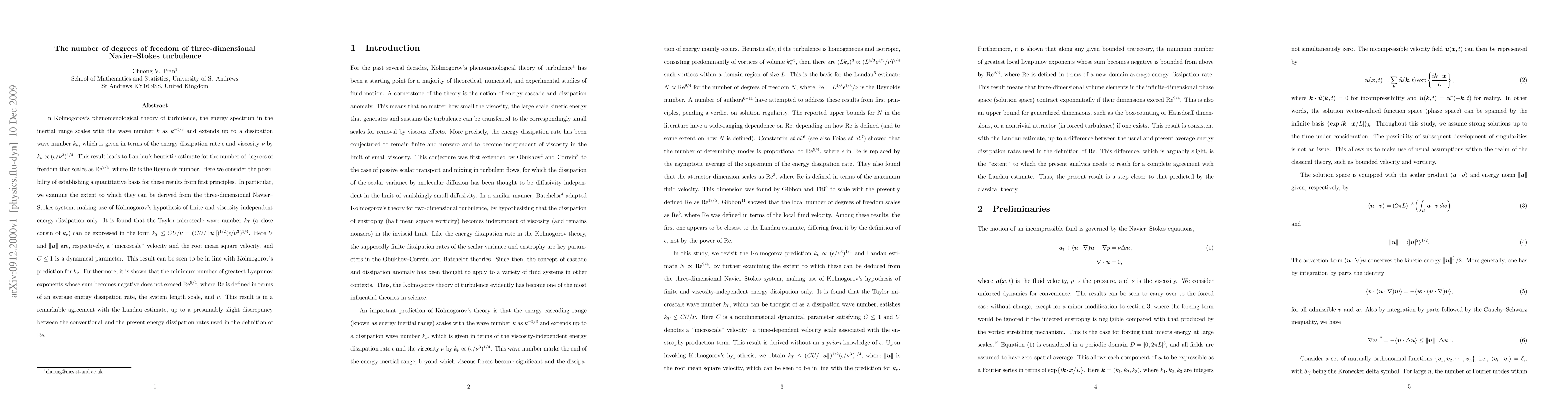 In Kolmogorov's phenomenological theory of turbulence, the energy spectrum in the inertial range scales with the wave number $k$ as $k^{-5/3}$ and extends up to a dissipation wave number $k_\nu$, which is given in terms of the energy dissipation rate $\epsilon$ and viscosity $\nu$ by $k_\nu\propto(\epsilon/\nu^3)^{1/4}$. This result leads to Landau's heuristic estimate for the number of degrees of freedom that scales as $\Re^{9/4}$, where $\Re$ is the Reynolds number. Here we consider the possibility of establishing a quantitative basis for these results from first principles. In particular, we examine the extent to which they can be derived from the three-dimensional Navier--Stokes system, making use of Kolmogorov's hypothesis of finite and viscosity-independent energy dissipation only. It is found that the Taylor microscale wave number $k_T$ (a close cousin of $k_\nu$) can be expressed in the form $k_T \le CU/\nu = (CU/\norm{\u})^{1/2}(\epsilon/\nu^3)^{1/4}$. Here $U$ and $\norm{\u}$ are, respectively, a ``microscale'' velocity and the root mean square velocity, and $C\le1$ is a dynamical parameter. This result can be seen to be in line with Kolmogorov's prediction for $k_\nu$. Furthermore, it is shown that the minimum number of greatest Lyapunov exponents whose sum becomes negative does not exceed $\Re^{9/4}$, where $\Re$ is defined in terms of an average energy dissipation rate, the system length scale, and $\nu$. This result is in a remarkable agreement with the Landau estimate, up to a presumably slight discrepancy between the conventional and the present energy dissipation rates used in the definition of $\Re$.