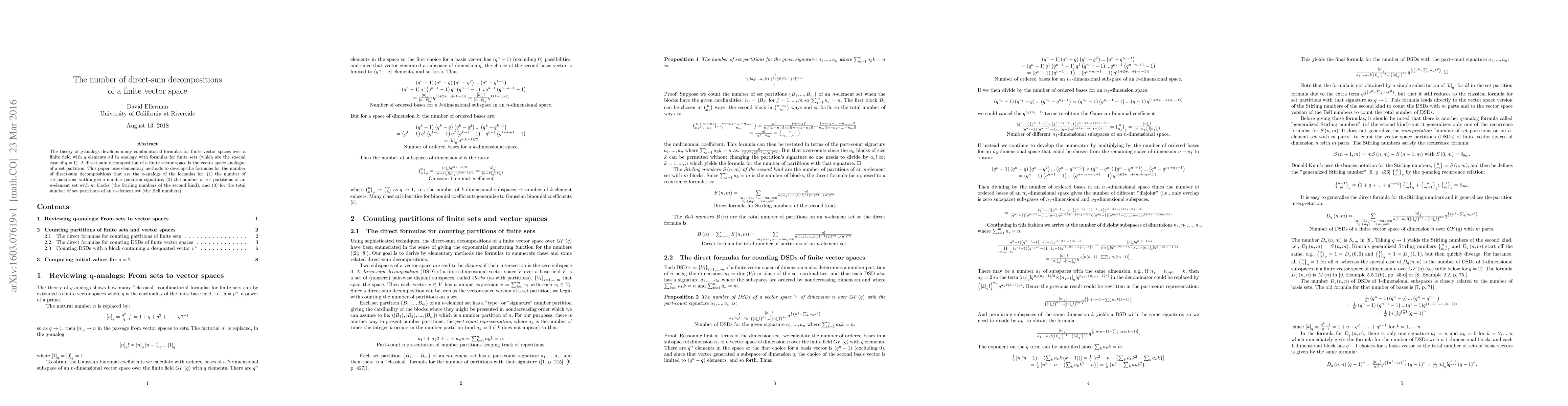 The theory of q-analogs develops many combinatorial formulas for finite vector spaces over a finite field with q elements--all in analogy with formulas for finite sets (which are the special case of q=1). A direct-sum decomposition of a finite vector space is the vector space analogue of a set partition. This paper develops the formulas for the number of direct-sum decompositions that are the q-analogs of the formulas for: (1) the number of set partitions with a given number partition signature; (2) the number of set partitions of an n-element set with m blocks (the Stirling numbers of the second kind); and (3) for the total number of set partitions of an n-element set (the Bell numbers).