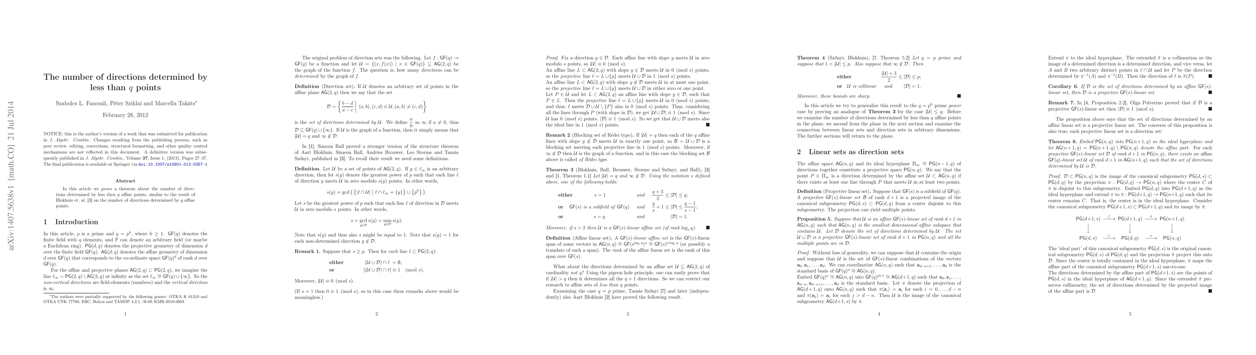 In this article we prove a theorem about the number of directions determined by less then $q$ affine points, similar to the result of Blokhuis et al. (in J. Comb. Theory Ser. A 86(1), 187-196, 1999) on the number of directions determined by $q$ affine points.
