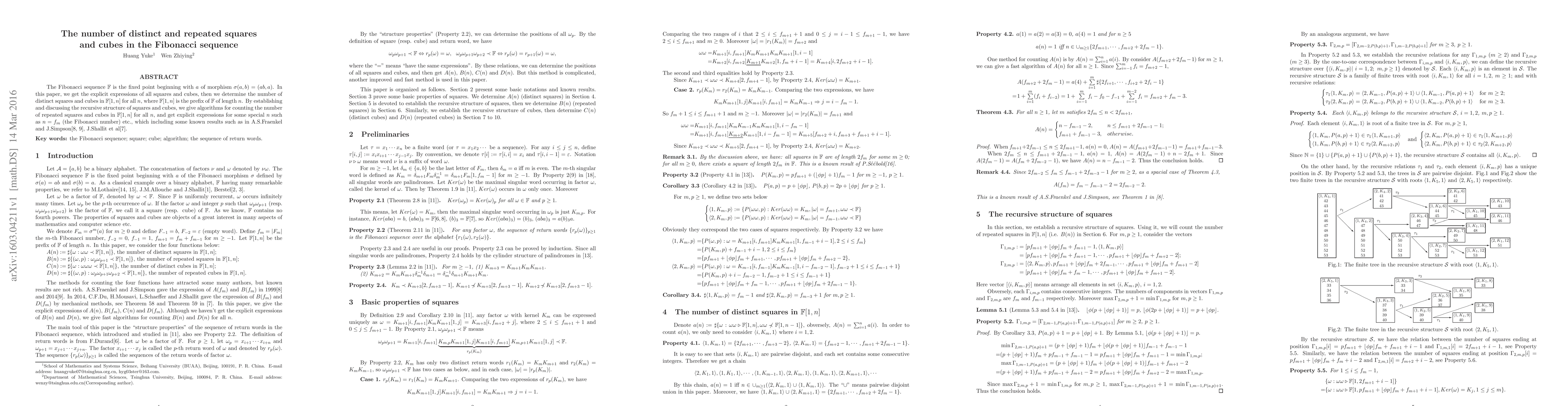 The Fibonacci sequence $\mathbb{F}$ is the fixed point beginning with $a$ of morphism $\sigma(a,b)=(ab,a)$. In this paper, we get the explicit expressions of all squares and cubes, then we determine the number of distinct squares and cubes in $\mathbb{F}[1,n]$ for all $n$, where $\mathbb{F}[1,n]$ is the prefix of $\mathbb{F}$ of length $n$. By establishing and discussing the recursive structure of squares and cubes, we give algorithms for counting the number of repeated squares and cubes in $\mathbb{F}[1,n]$ for all $n$, and get explicit expressions for some special $n$ such as $n=f_m$ (the Fibonacci number) etc., which including some known results such as in A.S.Fraenkel and J.Simpson, J.Shallit et al.