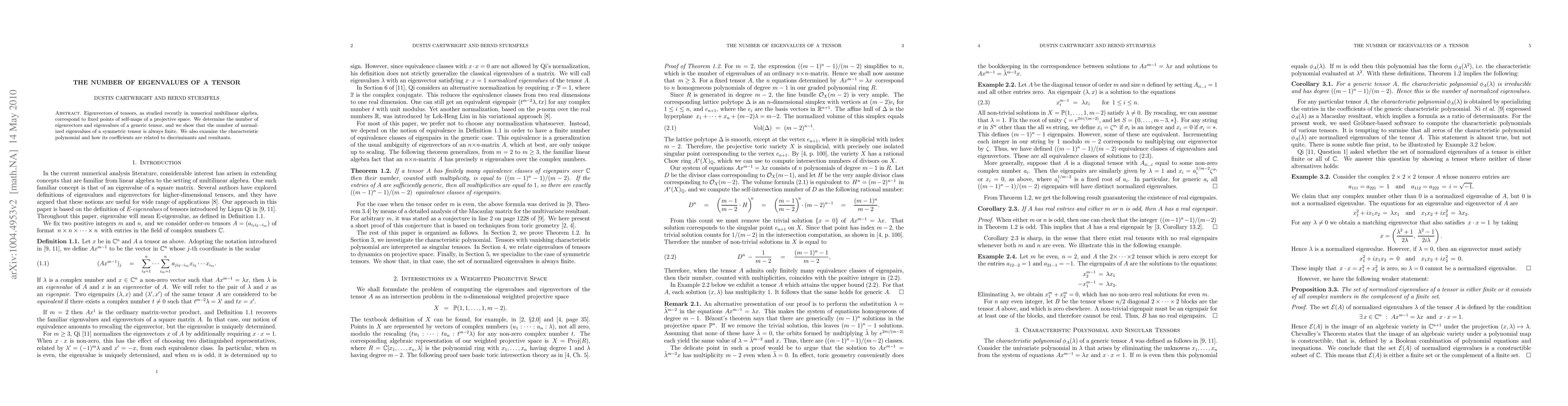 This paper determines the number of eigenvectors and eigenvalues for generic tensors, proving that symmetric tensors have a finite number of normalized eigenvalues. It also explores the relationship between the characteristic polynomial's coefficients and discriminants and resultants.