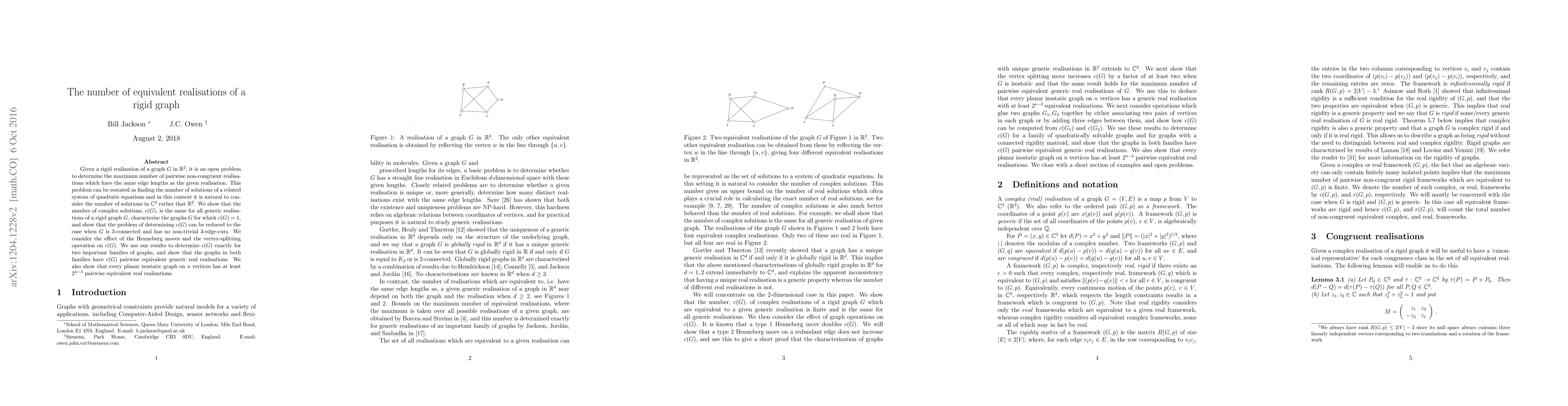 Given a rigid realisation of a graph $G$ in ${\mathbb R}^2$, it is an open problem to determine the maximum number of pairwise non-congruent realisations which have the same edge lengths as the given realisation. This problem can be restated as finding the number of solutions of a related system of quadratic equations and in this context it is natural to consider the number of solutions in ${\mathbb C}^2$ rather that ${\mathbb R}^2$. We show that the number of complex solutions, $c(G)$, is the same for all generic realisations of a rigid graph $G$, characterise the graphs $G$ for which $c(G)=1$, and show that the problem of determining $c(G)$ can be reduced to the case when $G$ is $3$-connected and has no non-trivial $3$-edge-cuts. We consider the effect of the Henneberg moves and the vertex-splitting operation on $c(G)$. We use our results to determine $c(G)$ exactly for two important families of graphs, and show that the graphs in both families have $c(G)$ pairwise equivalent generic real realisations. We also show that every planar isostatic graph on $n$ vertices has at least $2^{n-3}$ pairwise equivalent real realisations.