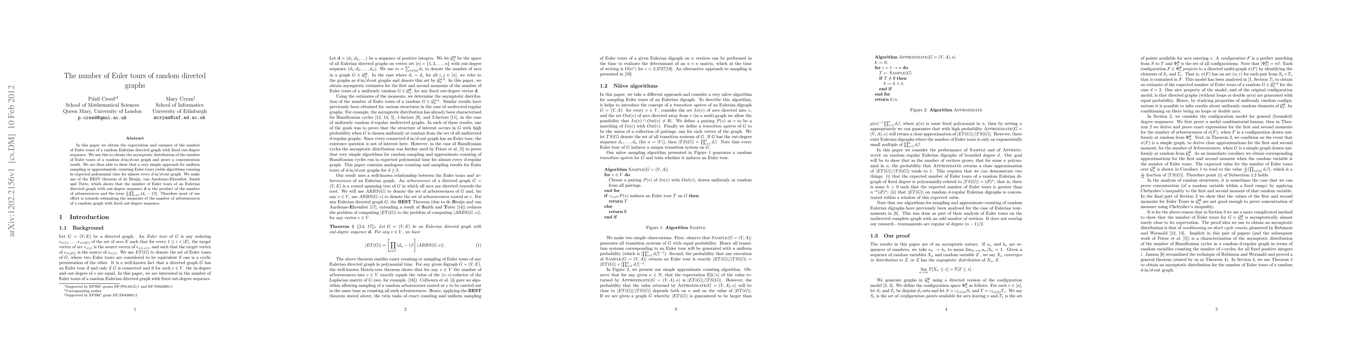 The paper derives the expectation and variance of the number of Euler tours in a random Eulerian directed graph with a fixed out-degree sequence, using the BEST theorem. It then extends this to the asymptotic distribution of Euler tours in a random $d$-in/$d$-out graph, proving concentration results and demonstrating polynomial-time algorithms for uniform sampling or approximate counting of Euler tours for almost every $d$-in/$d$-out graph.