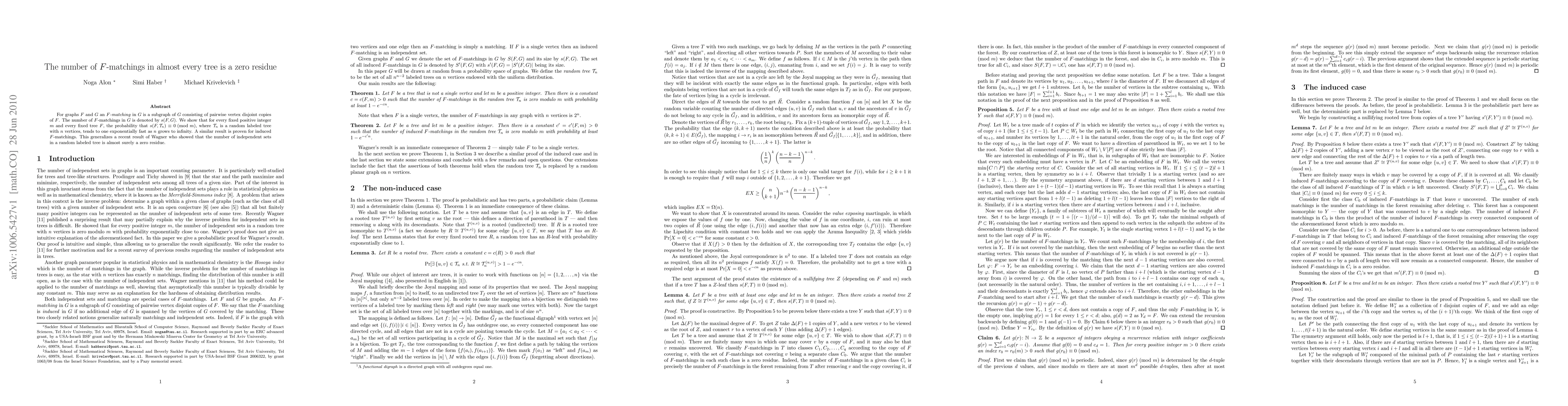 The paper shows that for every fixed tree F and a random labeled tree T_n with n vertices, the probability that the number of F-matchings in T_n is a zero residue tends to 1 exponentially fast as n grows.