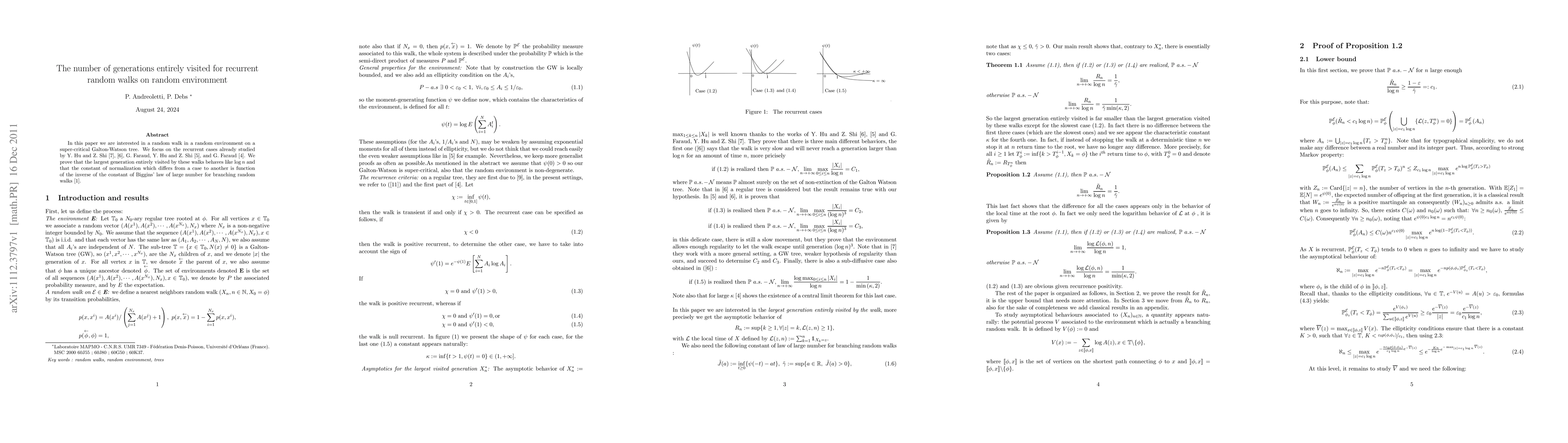 In this paper we are interested in a random walk in a random environment on a super-critical Galton-Watson tree. We focus on the recurrent cases already studied by Y. Hu and Z. Shi and G. Faraud. We prove that the largest generation entirely visited by these walks behaves like log n and that the constant of normalization which differs from a case to another is function of the inverse of the constant of Biggins' law of large number for branching random walks.