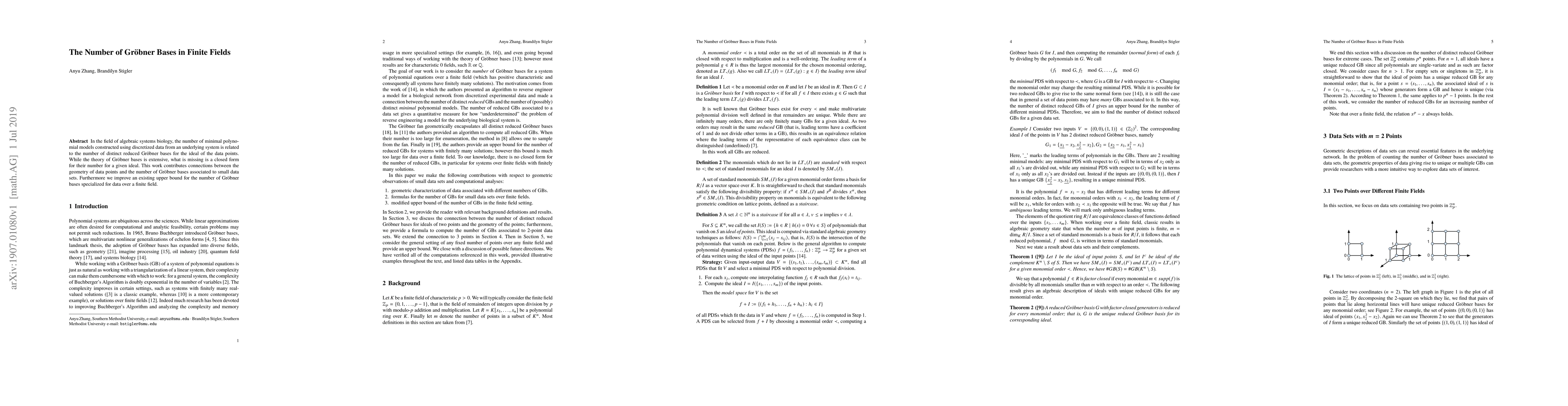 This study explores the relationship between the number of minimal polynomial models in algebraic systems biology and the count of distinct reduced Gröbner bases for a given ideal, especially over finite fields. It improves existing upper bounds for the number of Gröbner bases in these contexts, providing new insights into the geometry of data points.