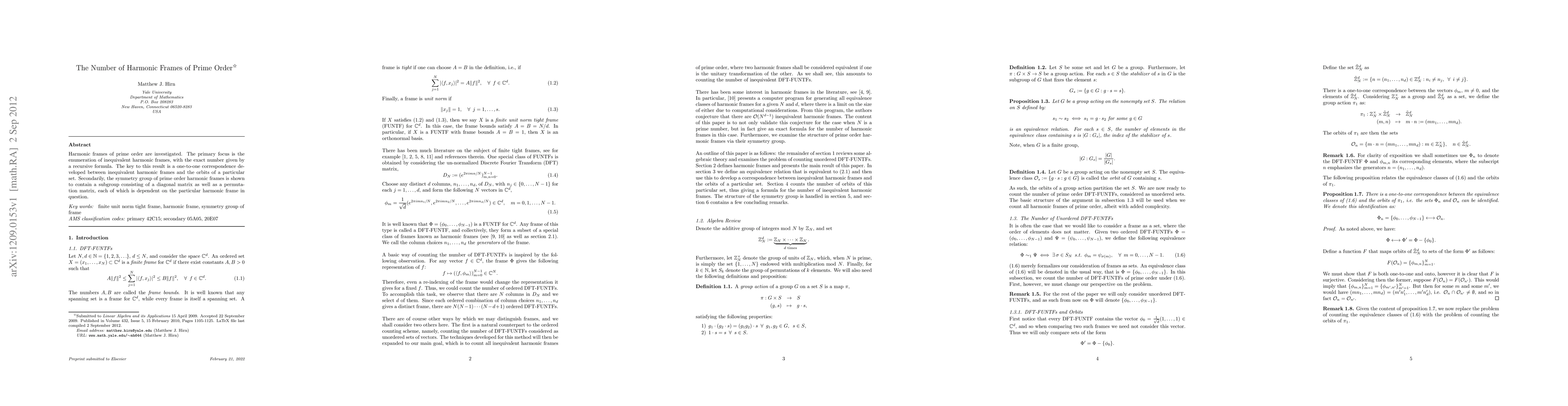 Harmonic frames of prime order are investigated. The primary focus is the enumeration of inequivalent harmonic frames, with the exact number given by a recursive formula. The key to this result is a one-to-one correspondence developed between inequivalent harmonic frames and the orbits of a particular set. Secondarily, the symmetry group of prime order harmonic frames is shown to contain a subgroup consisting of a diagonal matrix as well as a permutation matrix, each of which is dependent on the particular harmonic frame in question.