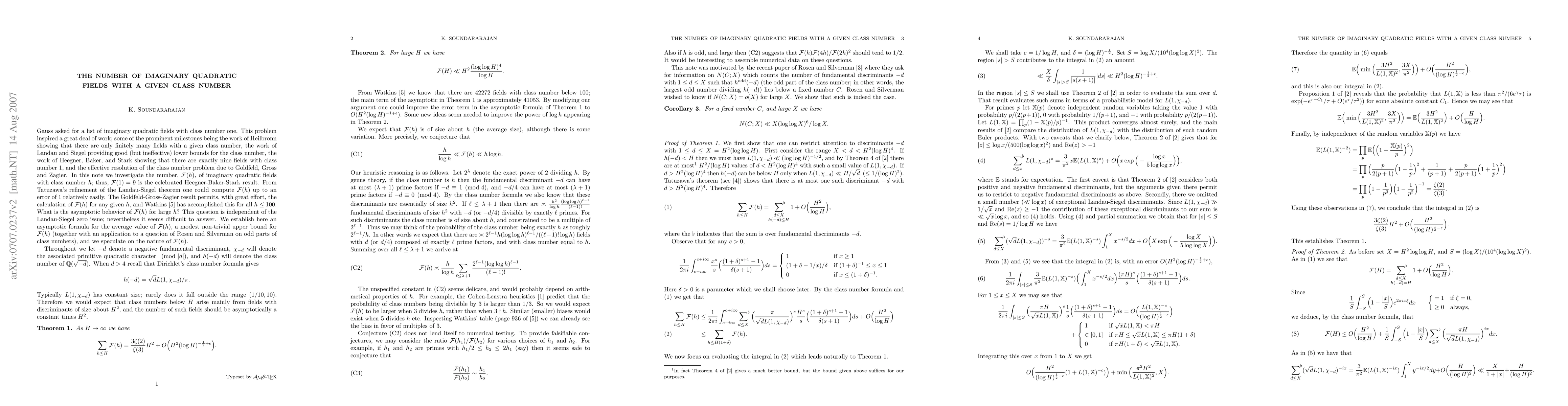 This paper investigates the number of imaginary quadratic fields with a given class number $h$, establishing an asymptotic formula for the average value of ${\Cal F}(h)$ and providing a modest upper bound for ${\Cal F}(h)$. It also applies these results to a question posed by Rosen and Silverman regarding the odd part of the class number.