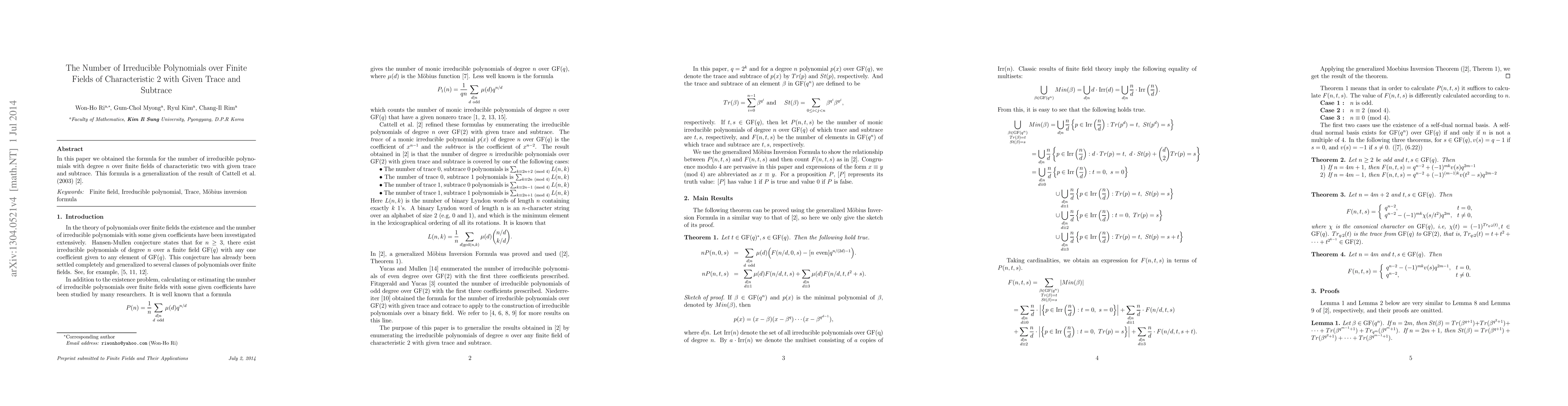 This research paper presents a formula for counting irreducible polynomials of degree n over finite fields of characteristic 2, given specific trace and subtrace values. It extends the earlier work of Cattell et al. (2003).