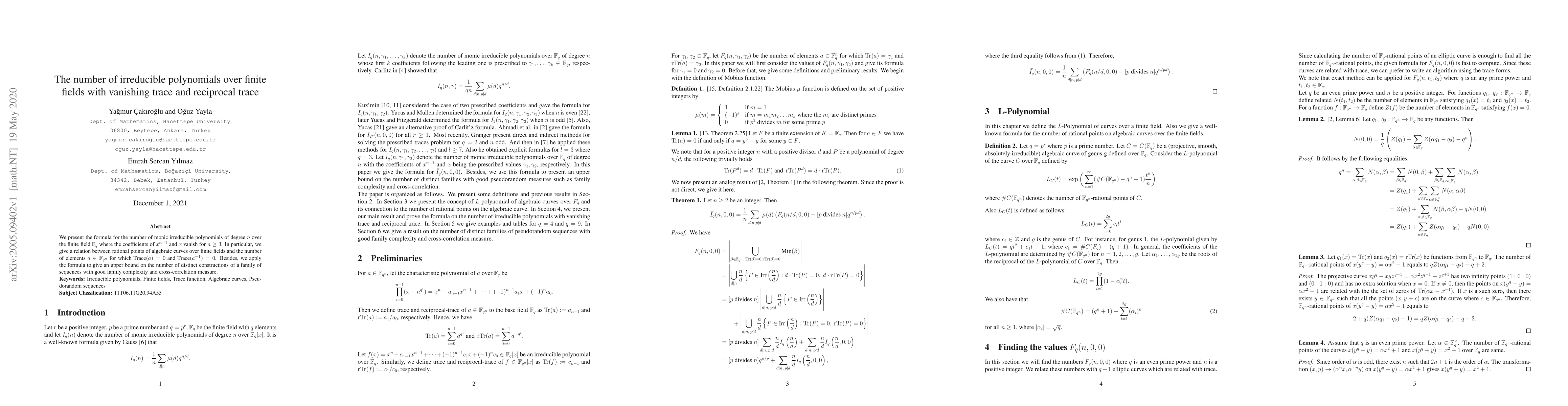 This paper provides a formula for counting irreducible polynomials over finite fields with vanishing trace and reciprocal trace, relating to rational points on algebraic curves and sequence constructions.