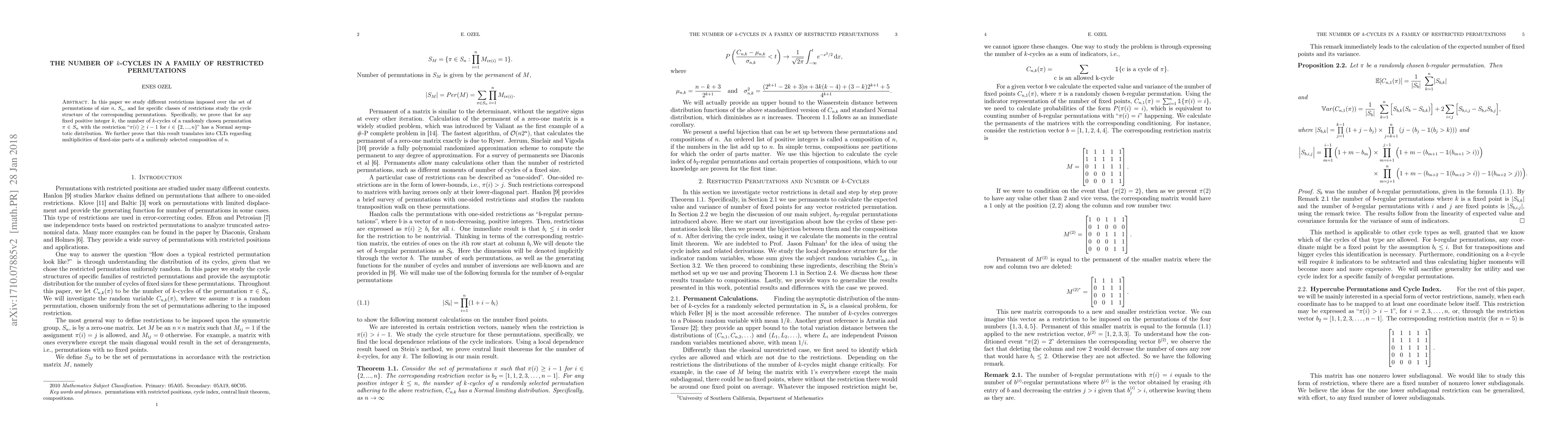 In this paper we study different restrictions imposed over the set of permutations of size $n$, $S_n$, and for specific classes of restrictions study the cycle structure of corresponding permutations. More specifically, we prove that for any fixed positive integer $k$, the number of $k$-cycles of a uniformly chosen permutation $\pi \in S_n$ with the restriction "$\pi(i) \geq i-1$" for $i \in \{2, \ldots, n\}$ has a Normal asymptotic distribution. We further prove that this result translates into CLTs regarding multiplicities of fixed-size parts of a uniformly selected composition of $n$.