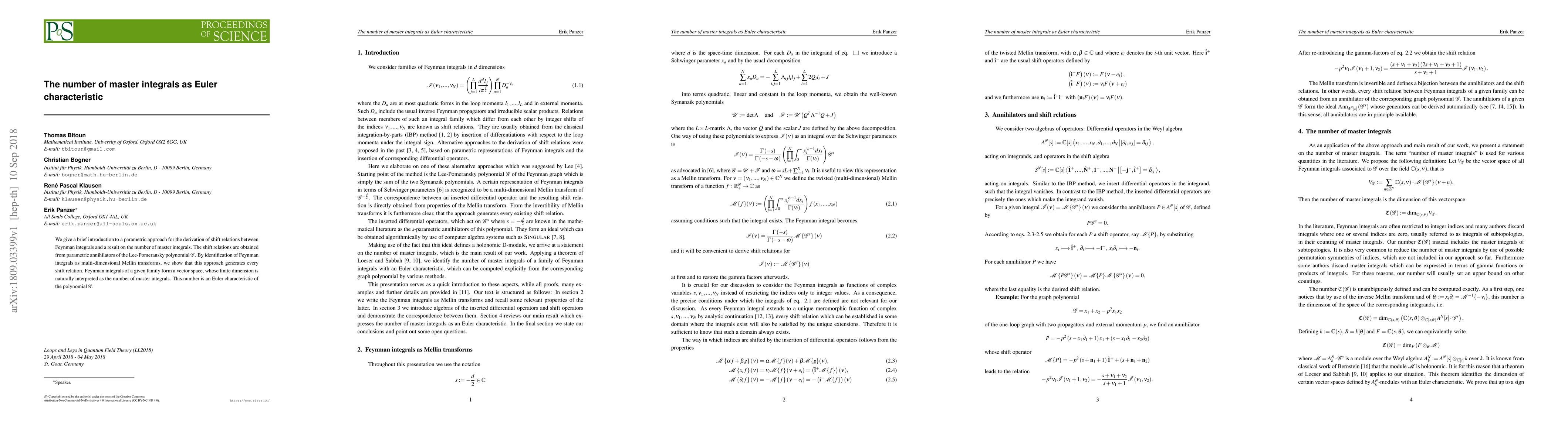 This paper explores a parametric method to derive shift relations between Feynman integrals, revealing that the number of master integrals corresponds to the Euler characteristic of the Lee-Pomeransky polynomial $\mathcal{G}$. The approach identifies Feynman integrals as multi-dimensional Mellin transforms, linking their vector space dimension to the Euler characteristic.