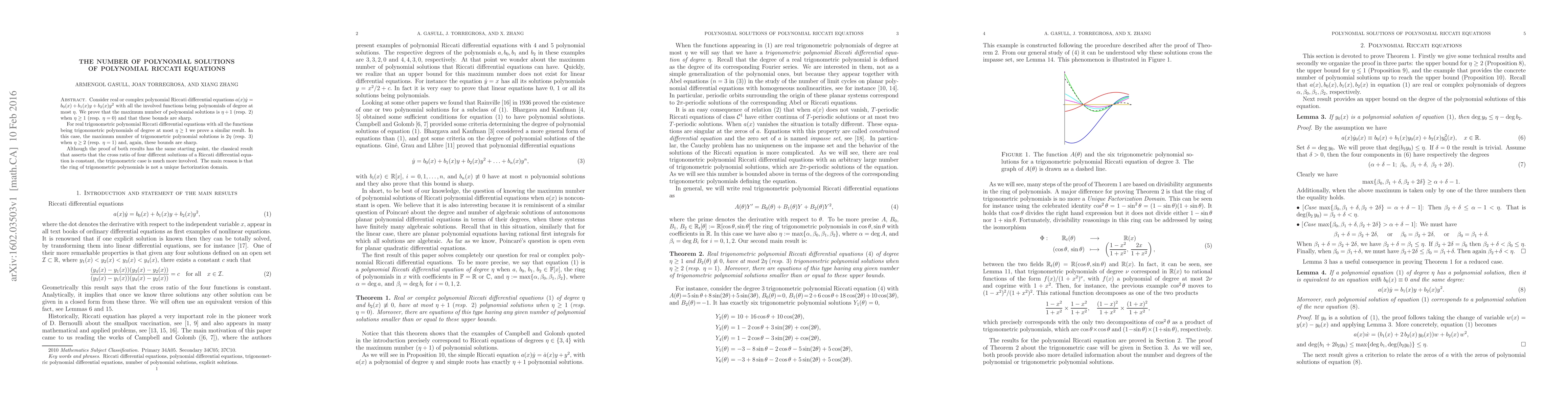 Consider real or complex polynomial Riccati differential equations $a(x) \dot y=b_0(x)+b_1(x)y+b_2(x)y^2$ with all the involved functions being polynomials of degree at most $\eta$. We prove that the maximum number of polynomial solutions is $\eta+1$ (resp. 2) when $\eta\ge 1$ (resp. $\eta=0$) and that these bounds are sharp. For real trigonometric polynomial Riccati differential equations with all the functions being trigonometric polynomials of degree at most $\eta\ge 1$ we prove a similar result. In this case, the maximum number of trigonometric polynomial solutions is $2\eta$ (resp. $3$) when $\eta\ge 2$ (resp. $\eta=1$) and, again, these bounds are sharp. Although the proof of both results has the same starting point, the classical result that asserts that the cross ratio of four different solutions of a Riccati differential equation is constant, the trigonometric case is much more involved. The main reason is that the ring of trigonometric polynomials is not a unique factorization domain.