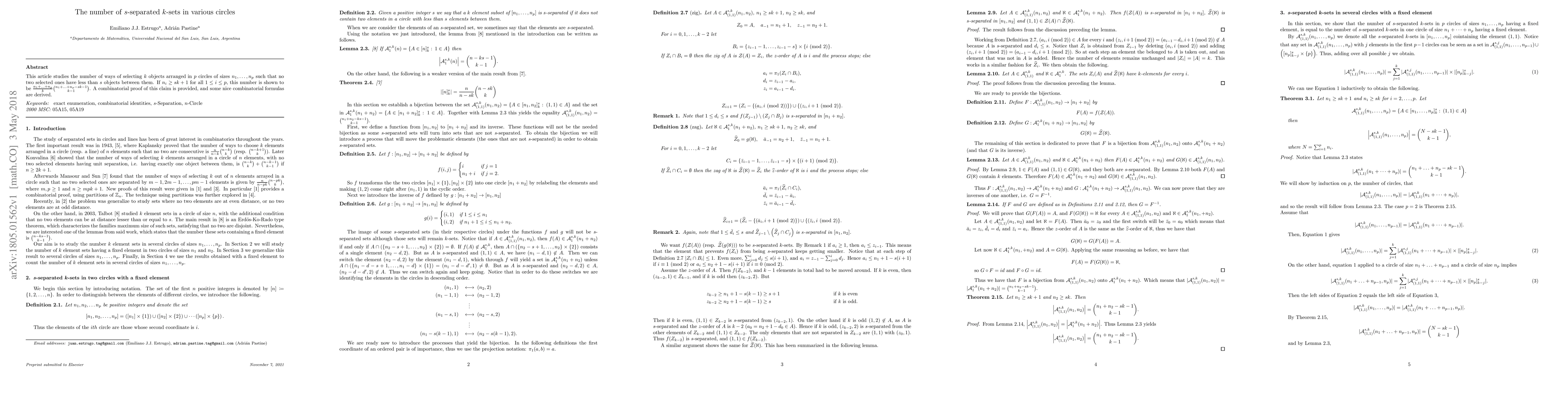This article studies the number of ways of selecting $k$ objects arranged in $p$ circles of sizes $n_1,\ldots,n_p$ such that no two selected ones have less than $s$ objects between them. If $n_i\geq sk+1$ for all $1\leq i \leq p$, this number is shown to be $\frac{n_1+\ldots+n_p}{k}\binom{n_1+\ldots+n_p-sk-1}{k-1}$. A combinatorial proof of this claim is provided, and some nice combinatorial formulas are derived.