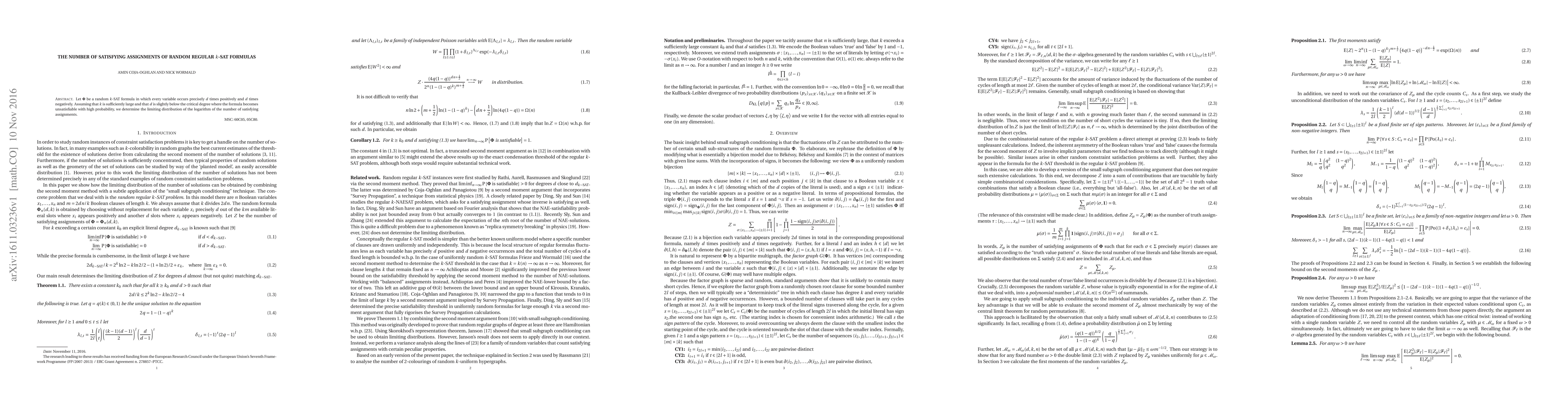 This paper investigates the number of satisfying assignments for random regular k-SAT formulas with variables occurring $d$ times positively and $d$ times negatively, determining the limiting distribution of the logarithm of these assignments when $k$ is large and $d$ is just below the unsatisfiability threshold.