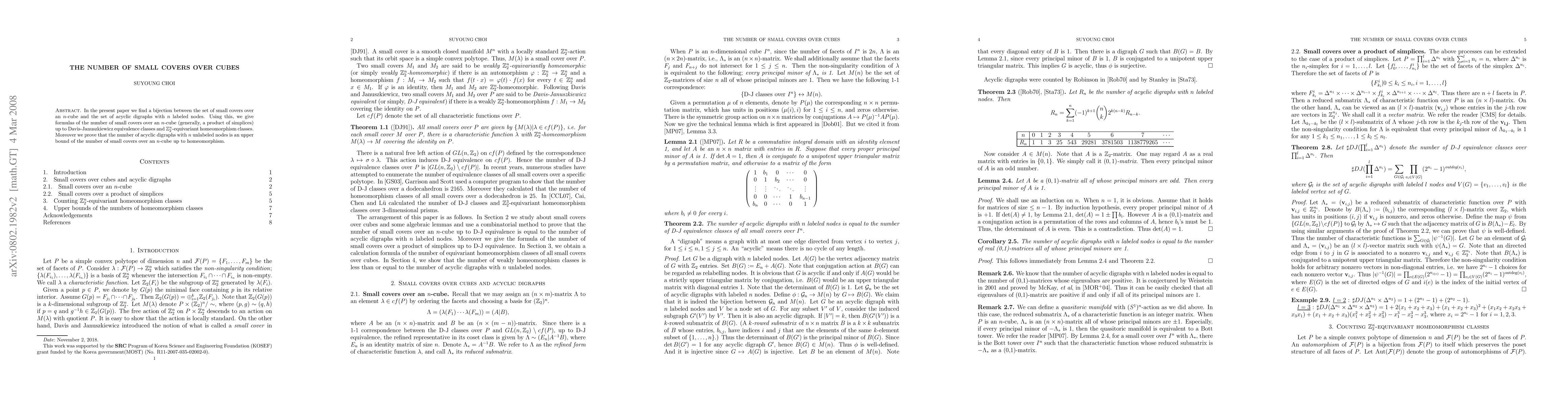 This paper establishes a bijection between small covers over an $n$-cube and acyclic digraphs with $n$ labeled nodes, providing a formula for the number of such covers and proving that the number of acyclic digraphs with $n$ unlabeled nodes is an upper bound for the number of these covers up to diffeomorphism.