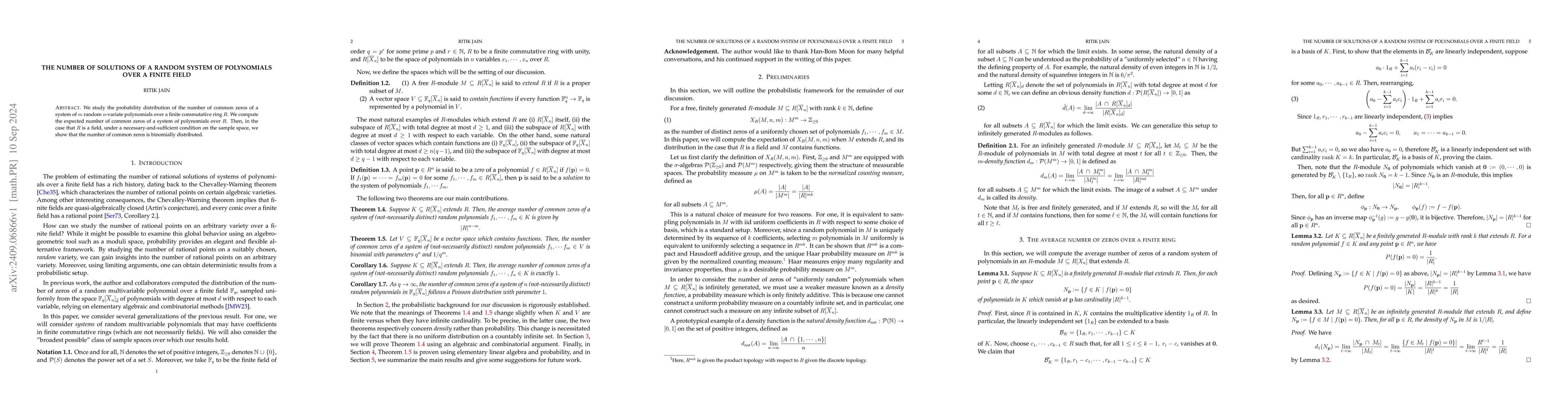 We study the probability distribution of the number of common zeros of a system of $m$ random $n$-variate polynomials over a finite commutative ring $R$. We compute the expected number of common zeros of a system of polynomials over $R$. Then, in the case that $R$ is a field, under a necessary-and-sufficient condition on the sample space, we show that the number of common zeros is binomially distributed.