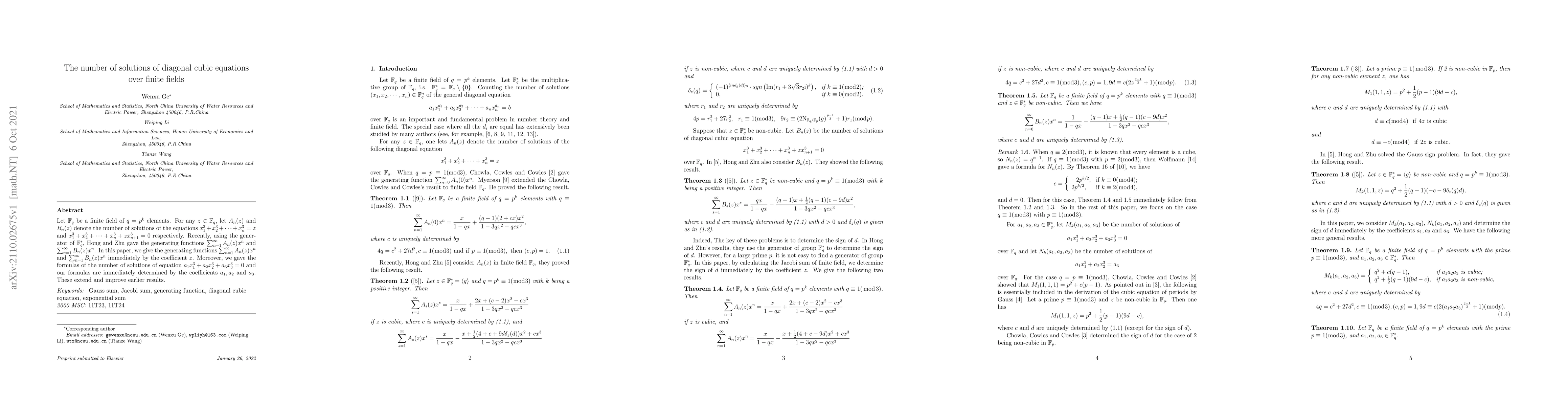 Researchers found generating functions to quickly calculate solutions of diagonal cubic equations over finite fields, improving earlier results.