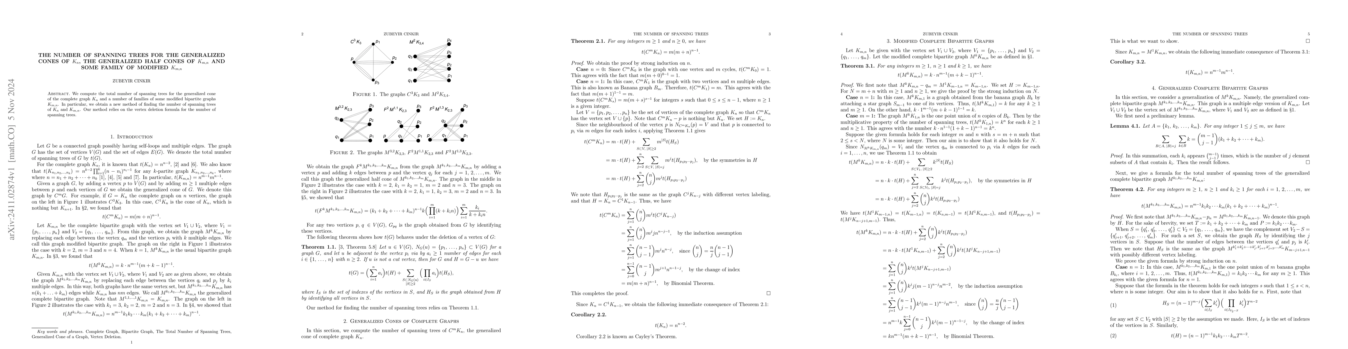 This paper calculates the total number of spanning trees for generalized cones of complete graphs $K_n$ and modified bipartite graphs $K_{m,n}$. It introduces a novel method using the vertex deletion formula to determine these counts.