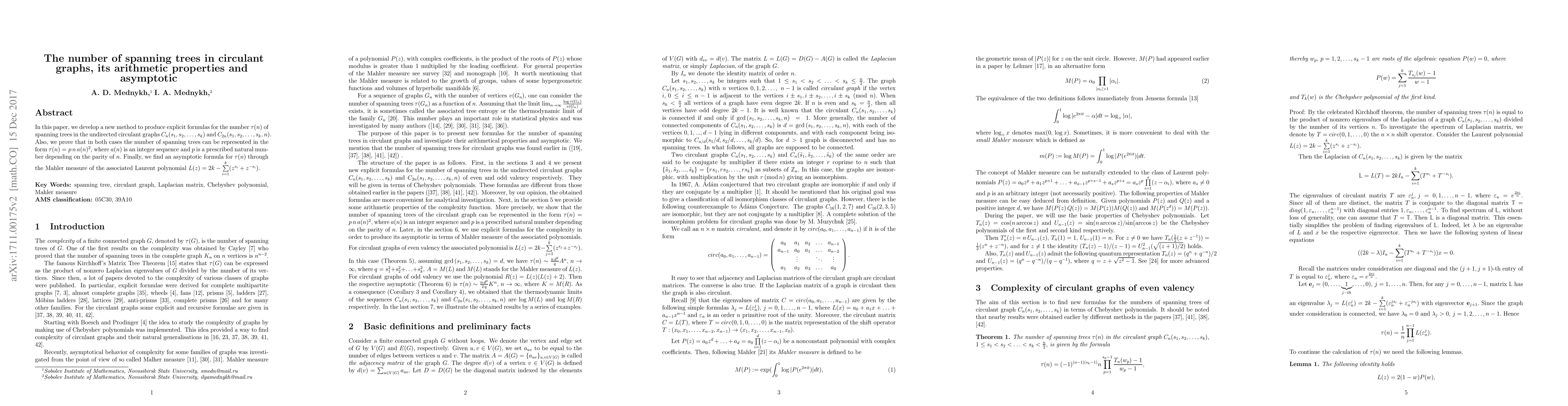 This paper introduces a novel method to derive explicit formulas for the number of spanning trees in circulant graphs, showing that $\tau(n) = p \, n \, a(n)^2$ and finding an asymptotic formula linked to the Mahler measure of a related Laurent polynomial.