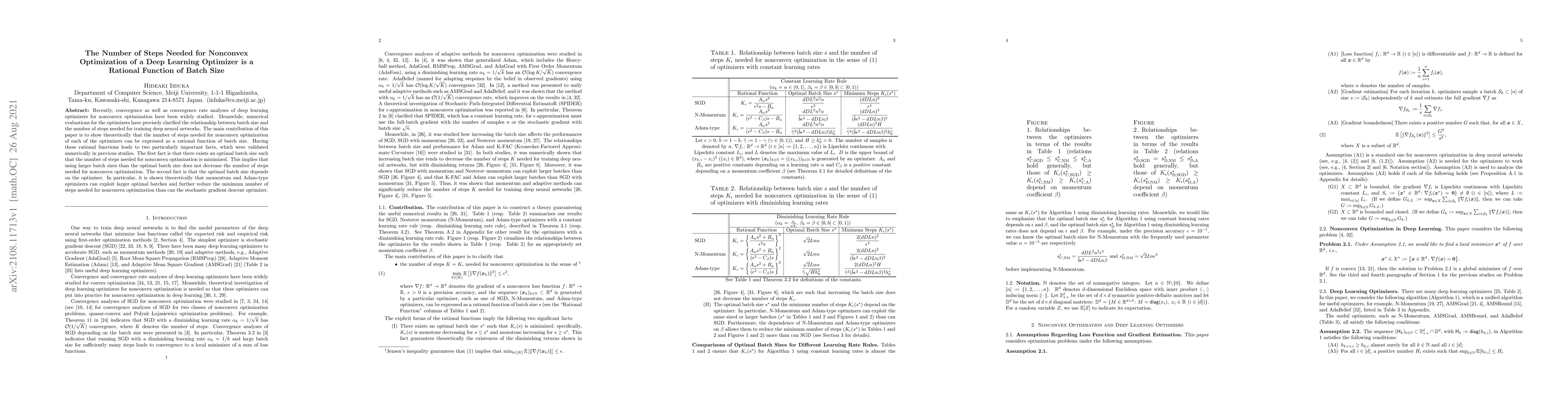 Recently, convergence as well as convergence rate analyses of deep learning optimizers for nonconvex optimization have been widely studied. Meanwhile, numerical evaluations for the optimizers have precisely clarified the relationship between batch size and the number of steps needed for training deep neural networks. The main contribution of this paper is to show theoretically that the number of steps needed for nonconvex optimization of each of the optimizers can be expressed as a rational function of batch size. Having these rational functions leads to two particularly important facts, which were validated numerically in previous studies. The first fact is that there exists an optimal batch size such that the number of steps needed for nonconvex optimization is minimized. This implies that using larger batch sizes than the optimal batch size does not decrease the number of steps needed for nonconvex optimization. The second fact is that the optimal batch size depends on the optimizer. In particular, it is shown theoretically that momentum and Adam-type optimizers can exploit larger optimal batches and further reduce the minimum number of steps needed for nonconvex optimization than can the stochastic gradient descent optimizer.