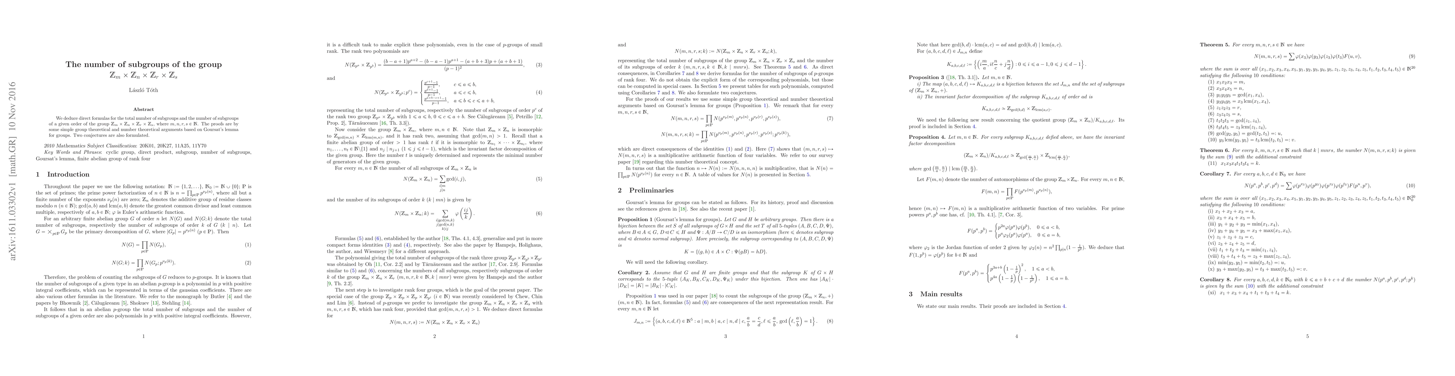 This paper provides direct formulas for the total number and the number of subgroups of a given order in the group $\Bbb{Z}_m\times \Bbb{Z}_n \times \Bbb{Z}_r \times \Bbb{Z}_s$, using group and number theory arguments based on Goursat's lemma, and proposes two conjectures.