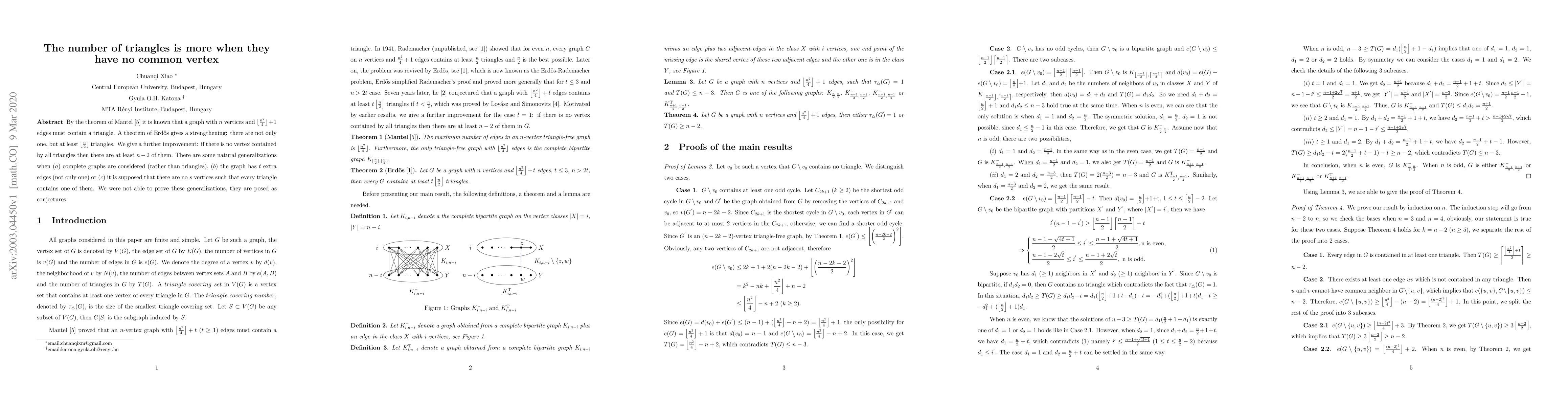 By the theorem of Mantel $[5]$ it is known that a graph with $n$ vertices and $\lfloor \frac{n^{2}}{4} \rfloor+1$ edges must contain a triangle. A theorem of Erd\H{o}s gives a strengthening: there are not only one, but at least $\lfloor\frac{n}{2}\rfloor$ triangles. We give a further improvement: if there is no vertex contained by all triangles then there are at least $n-2$ of them. There are some natural generalizations when $(a)$ complete graphs are considered (rather than triangles), $(b)$ the graph has $t$ extra edges (not only one) or $(c)$ it is supposed that there are no $s$ vertices such that every triangle contains one of them. We were not able to prove these generalizations, they are posed as conjectures.