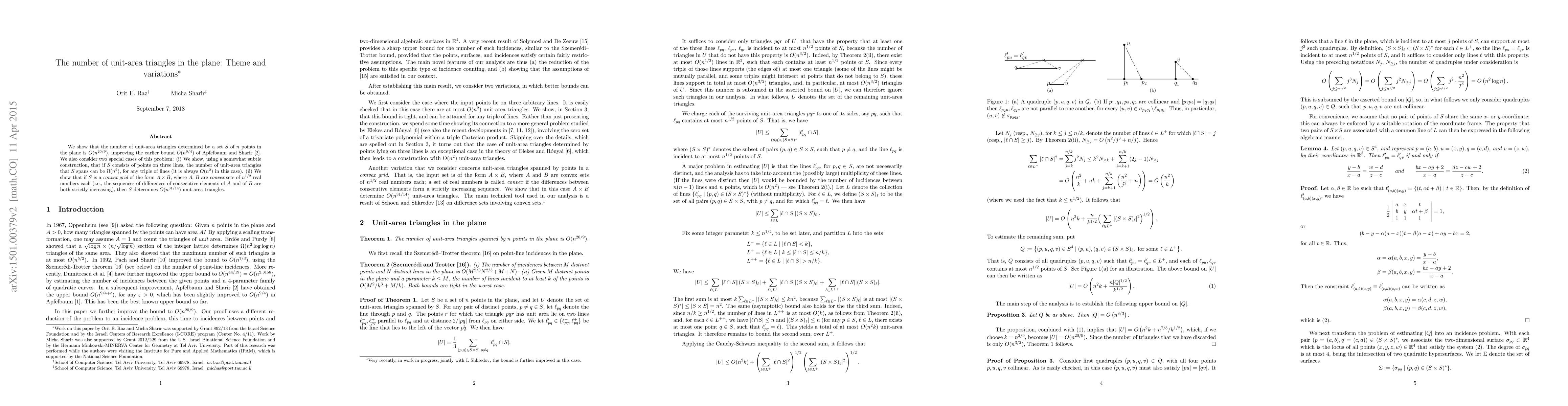 This paper improves the upper bound for the number of unit-area triangles formed by n points in a plane from O(n^9/4) to O(n^20/9). It also explores special cases: showing that with points on three lines, the count can be Ω(n^2), and for convex grids, the count is O(n^31/14).