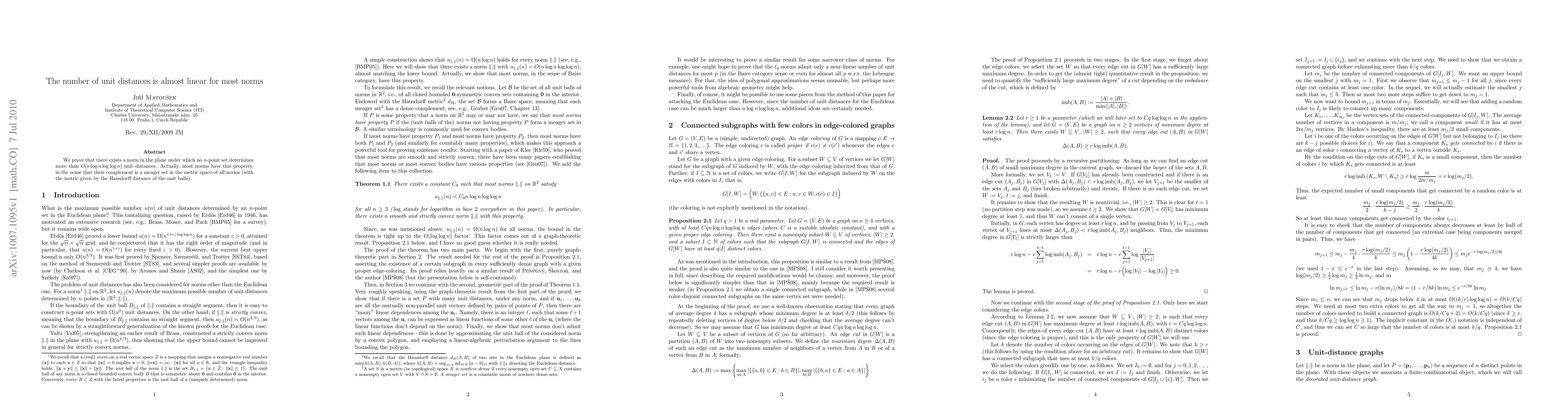 We prove that there exists a norm in the plane under which no n-point set determines more than O(n log n log log n) unit distances. Actually, most norms have this property, in the sense that their complement is a meager set in the metric space of all norms (with the metric given by the Hausdorff distance of the unit balls).