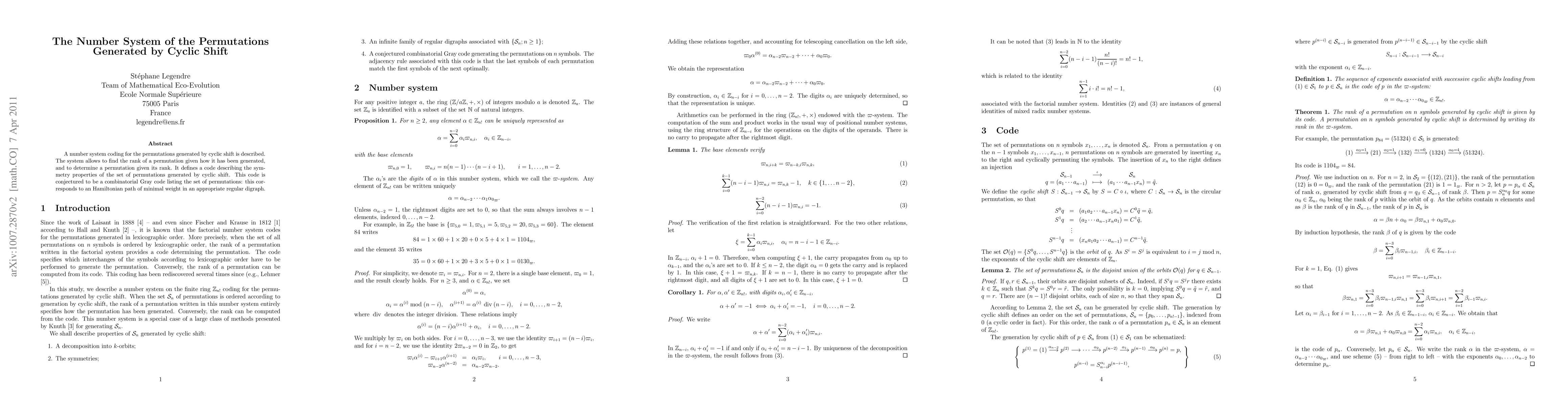 Researchers developed a number system to represent permutations generated by cyclic shift, allowing for the ranking of permutations and determining their generation order. This code is conjectured to form an optimal Hamiltonian path in a related regular digraph.