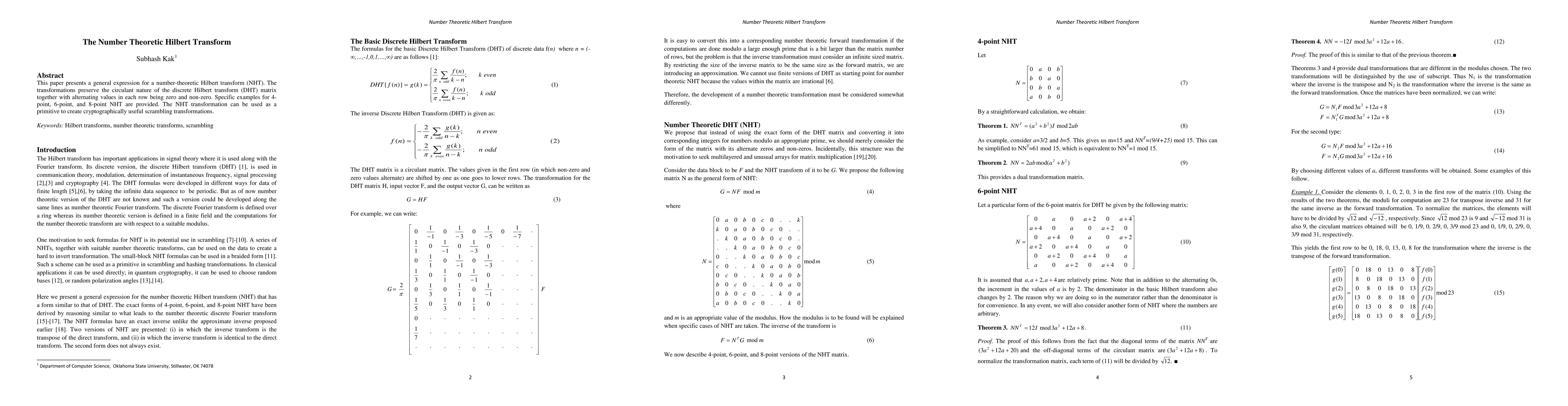 This paper introduces a number-theoretic Hilbert transform (NHT) that maintains the circulant structure of the discrete Hilbert transform (DHT) matrix, with alternating zero and non-zero values in each row. It provides specific examples for 4-point, 6-point, and 8-point NHTs and suggests its use in creating cryptographically useful scrambling transformations.