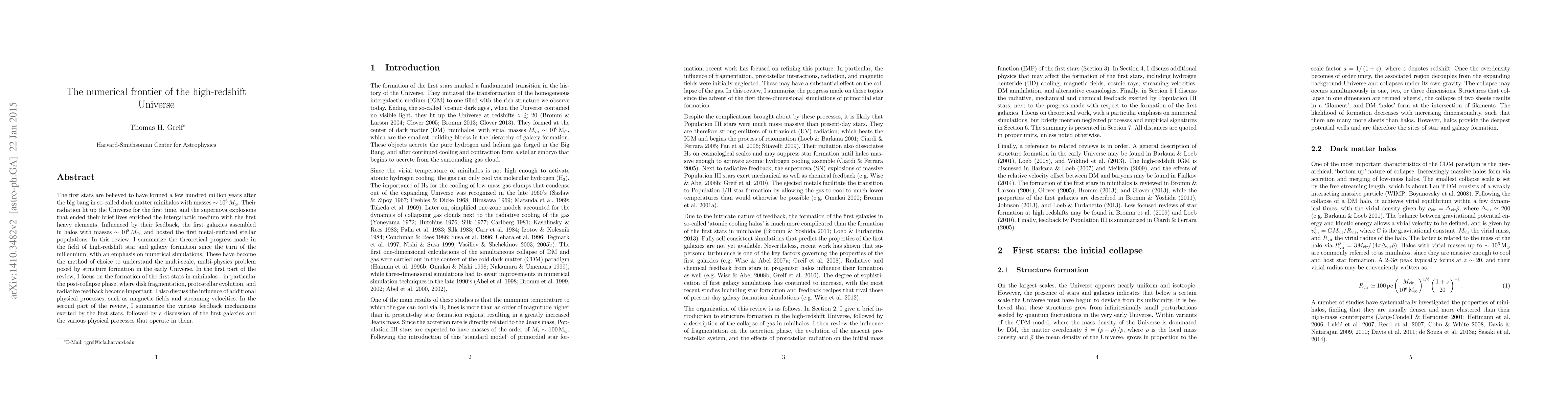 The first stars are believed to have formed a few hundred million years after the big bang in so-called dark matter minihalos with masses ~10^6 M_sun. Their radiation lit up the Universe for the first time, and the supernova explosions that ended their brief lives enriched the intergalactic medium with the first heavy elements. Influenced by their feedback, the first galaxies assembled in halos with masses ~10^8 M_sun, and hosted the first metal-enriched stellar populations. In this review, I summarize the theoretical progress made in the field of high-redshift star and galaxy formation since the turn of the millennium, with an emphasis on numerical simulations. These have become the method of choice to understand the multi-scale, multi-physics problem posed by structure formation in the early Universe. In the first part of the review, I focus on the formation of the first stars in minihalos - in particular the post-collapse phase, where disk fragmentation, protostellar evolution, and radiative feedback become important. I also discuss the influence of additional physical processes, such as magnetic fields and streaming velocities. In the second part of the review, I summarize the various feedback mechanisms exerted by the first stars, followed by a discussion of the first galaxies and the various physical processes that operate in them.
