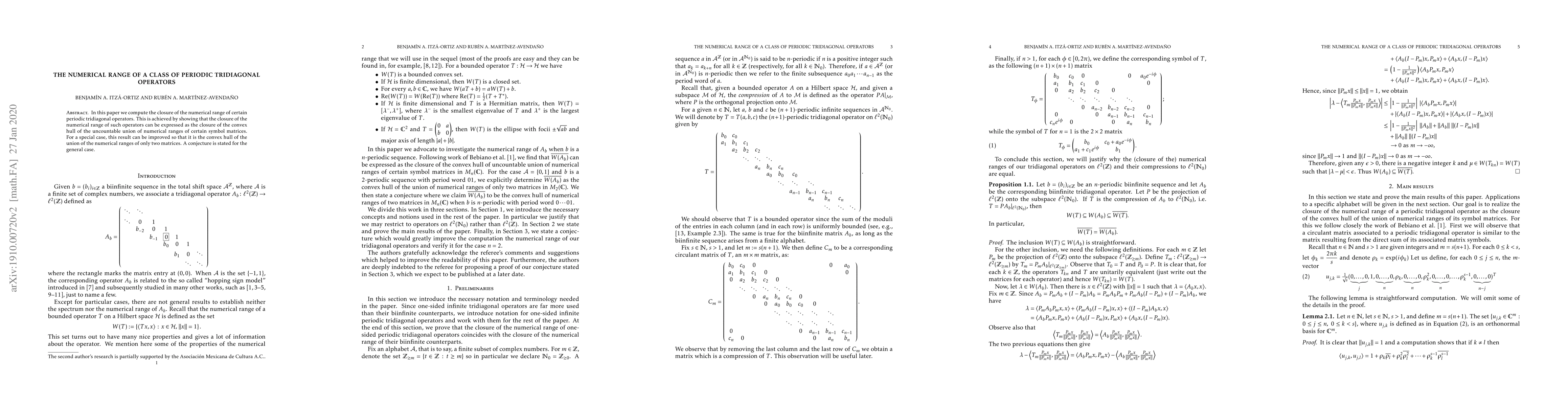 This paper computes the closure of the numerical range for periodic tridiagonal operators, showing it can be expressed as the closure of the convex hull of an uncountable union of numerical ranges of symbol matrices, with a special case reduced to two matrices. A conjecture is proposed for the general case.