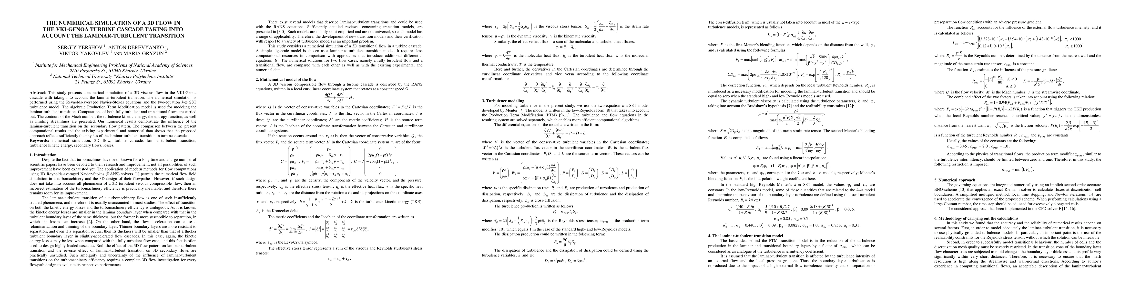 This paper simulates a 3D viscous flow in the VKI-Genoa turbine cascade, considering laminar-turbulent transition using Reynolds-averaged Navier-Stokes equations and the k-omega SST turbulence model. The results show significant influence of transition on secondary flow patterns and compare well with existing experimental data.
