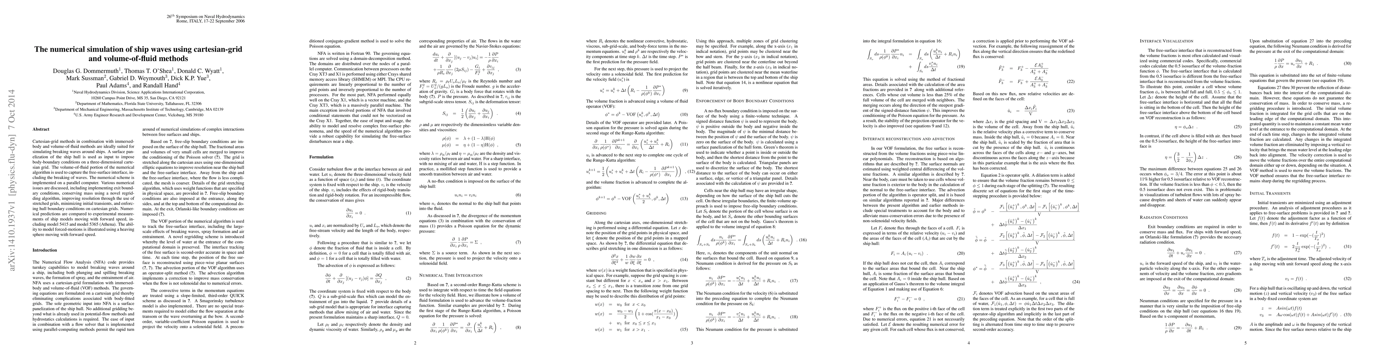 Cartesian-grid methods in combination with immersed-body and volume-of-fluid methods are ideally suited for simulating breaking waves around ships. A surface panelization of the ship hull is used as input to impose body-boundary conditions on a three-dimensional cartesian grid. The volume-of-fluid portion of the numerical algorithm is used to capture the free-surface interface, including the breaking of waves. The numerical scheme is implemented on a parallel computer. Various numerical issues are discussed, including implementing exit boundary conditions, conserving mass using a novel regridding algorithm, improving resolution through the use of stretched grids, minimizing initial transients, and enforcing hull boundary conditions on cartesian grids. Numerical predictions are compared to experimental measurements of ship models moving with forward speed, including model 5415 and model 5365 (Athena). The ability to model forced-motions is illustrated using a heaving sphere moving with forward speed.