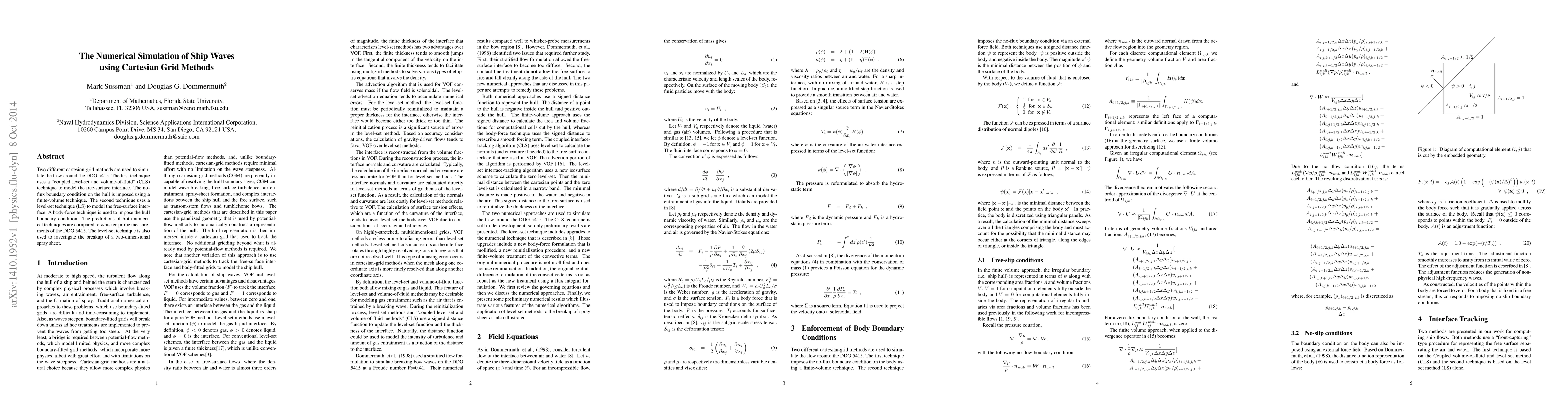 Two different cartesian-grid methods are used to simulate the flow around the DDG 5415. The first technique uses a "coupled level-set and volume-of-fluid" (CLS) technique to model the free-surface interface. The no-flux boundary condition on the hull is imposed using a finite-volume technique. The second technique uses a level-set technique (LS) to model the free-surface interface. A body-force technique is used to impose the hull boundary condition. The predictions of both numerical techniques are compared to whisker-probe measurements of the DDG 5415. The level-set technique is also used to investigate the breakup of a two-dimensional spray sheet.