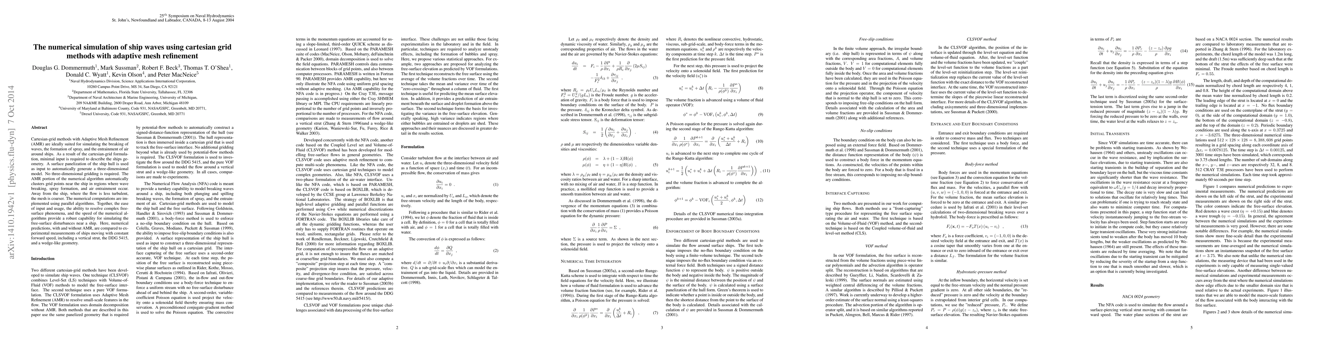Cartesian-grid methods with Adaptive Mesh Refinement (AMR) are ideally suited for simulating the breaking of waves, the formation of spray, and the entrainment of air around ships. As a result of the cartesian-grid formulation, minimal input is required to describe the ships geometry. A surface panelization of the ship hull is used as input to automatically generate a three-dimensional model. No three-dimensional gridding is required. The AMR portion of the numerical algorithm automatically clusters grid points near the ship in regions where wave breaking, spray formation, and air entrainment occur. Away from the ship, where the flow is less turbulent, the mesh is coarser. The numerical computations are implemented using parallel algorithms. Together, the ease of input and usage, the ability to resolve complex free-surface phenomena, and the speed of the numerical algorithms provide a robust capability for simulating the free-surface disturbances near a ship. Here, numerical predictions, with and without AMR, are compared to experimental measurements of ships moving with constant forward speed, including a vertical strut, the DDG 5415, and a wedge-like geometry.