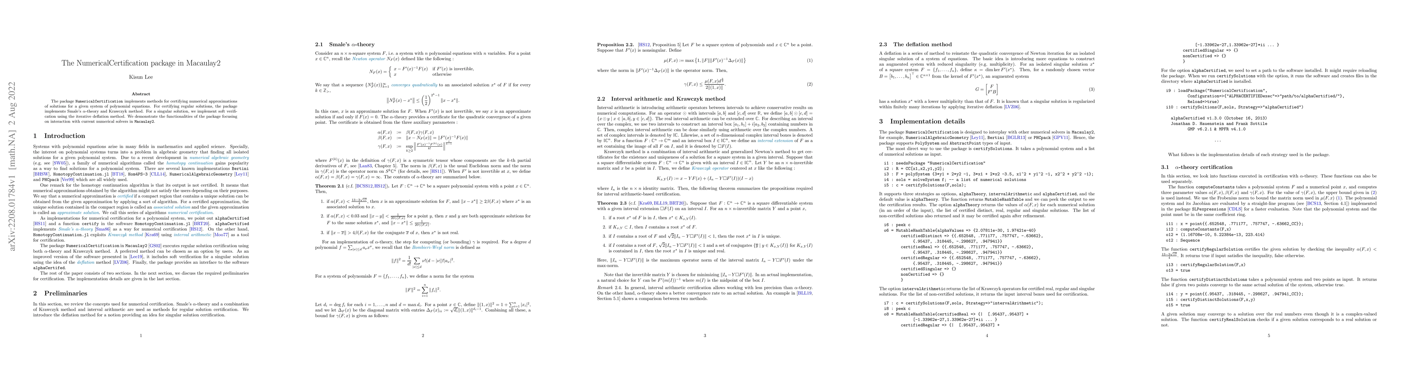 The NumericalCertification package in Macaulay2 certifies numerical approximations of polynomial equation solutions using Smale's $\alpha$-theory and Krawczyk method for regular solutions, and iterative deflation for singular solutions. It integrates with existing numerical solvers in Macaulay2.