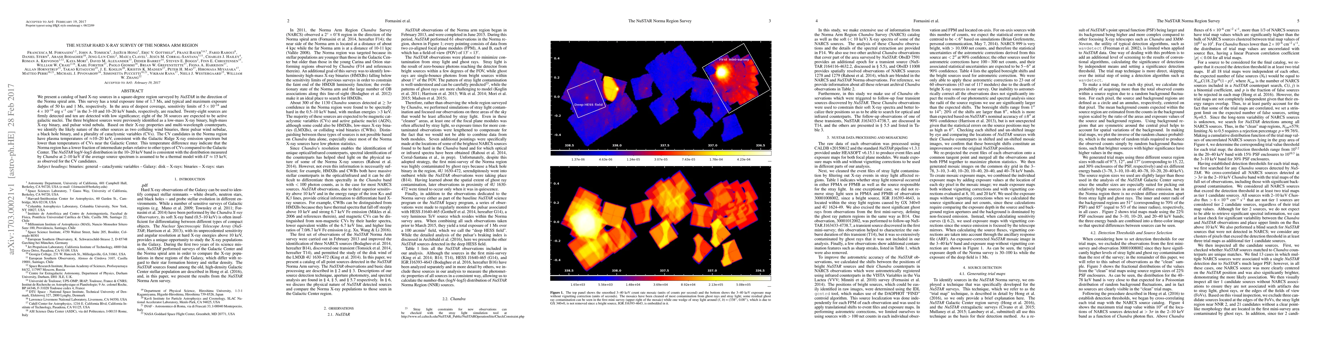 The NuSTAR survey of the Norma Arm region reveals 28 firmly detected and 10 low-significance hard X-ray sources, identifying eight as active galactic nuclei and classifying others as colliding wind binaries, pulsar wind nebulae, and cataclysmic variables. The CVs in this region exhibit lower temperatures than those near the Galactic Center, suggesting a different population distribution.