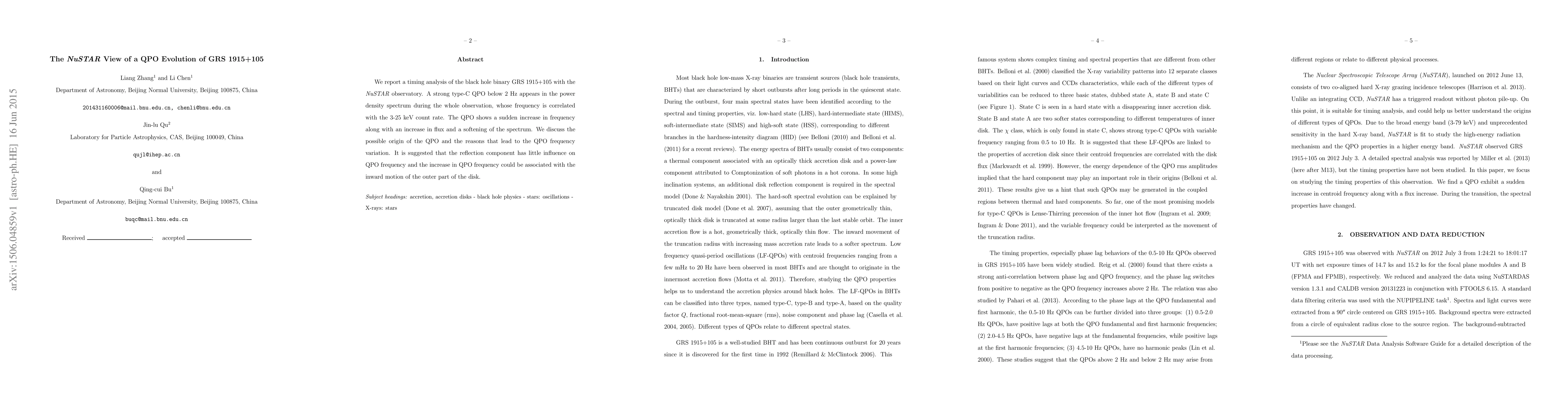 We report a timing analysis of the black hole binary GRS 1915+105 with the NuSTAR observatory. A strong type-C QPO below 2 Hz appears in the power density spectrum during the whole observation, whose frequency is correlated with the 3-25 keV count rate. The QPO shows a sudden increase in frequency along with an increase in flux and a softening of the spectrum. We discuss the possible origin of the QPO and the reasons that lead to the QPO frequency variation. It is suggested that the reflection component has little influence on QPO frequency and the increase in QPO frequency could be associated with the inward motion of the outer part of the disk.