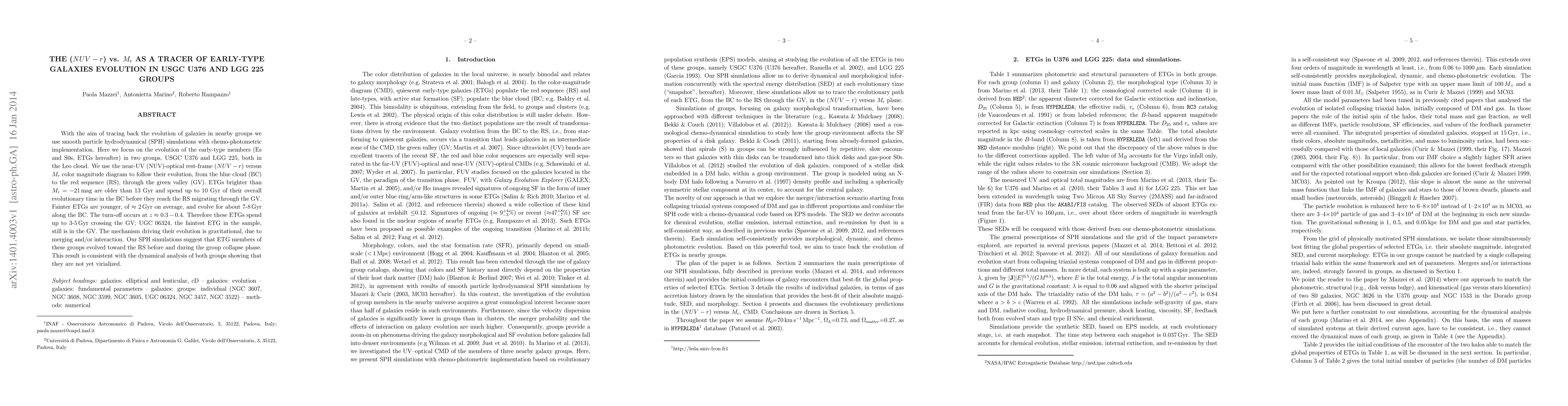 With the aim of tracing back the evolution of galaxies in nearby groups we use smooth particle hydrodynamical (SPH) simulations with chemo-photometric implementation. Here we focus on the evolution of the early-type members (Es and S0s, ETGs hereafter) in two groups, USGC U376 and LGG 225, both in the Leo cloud. We use the near-UV (NUV)-optical rest-frame $NUV-r$ versus $M_r$ color magnitude diagram to follow their evolution, from the blue cloud (BC) to the red sequence (RS), through the green valley (GV). ETGs brighter than $M_r=-21$ mag are older than 13 Gyr and spend up to 10 Gyr of their overall evolutionary time in the BC before they reach the RS migrating through the GV. Fainter ETGs are younger, of about 2 Gyr on average, and evolve for about 7-8 Gyr along the BC. The turn-off occurs at z ~ 0.3-0.4. Therefore these ETGs spend up to 3-5 Gyr crossing the GV; UGC 06324, the faintest ETG in the sample, still is in the GV. The mechanism driving their evolution is gravitational, due to merging and/or interaction. Our SPH simulations suggest that ETG members of these groups evolved toward the RS before and during the group collapse phase. This result is consistent with the dynamical analysis of both groups showing that they are not yet virialized.