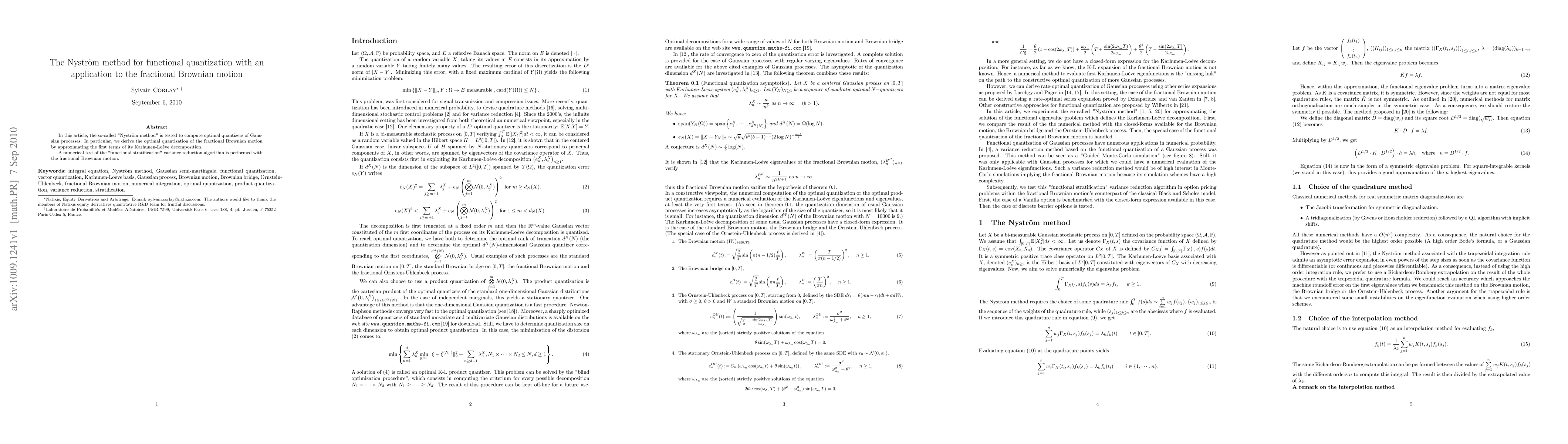 Summary: This paper explores the Nyström method for computing optimal quantizers of Gaussian processes, specifically applying it to fractional Brownian motion by approximating its Karhunen-Loève decomposition, and tests a functional stratification variance reduction algorithm numerically.