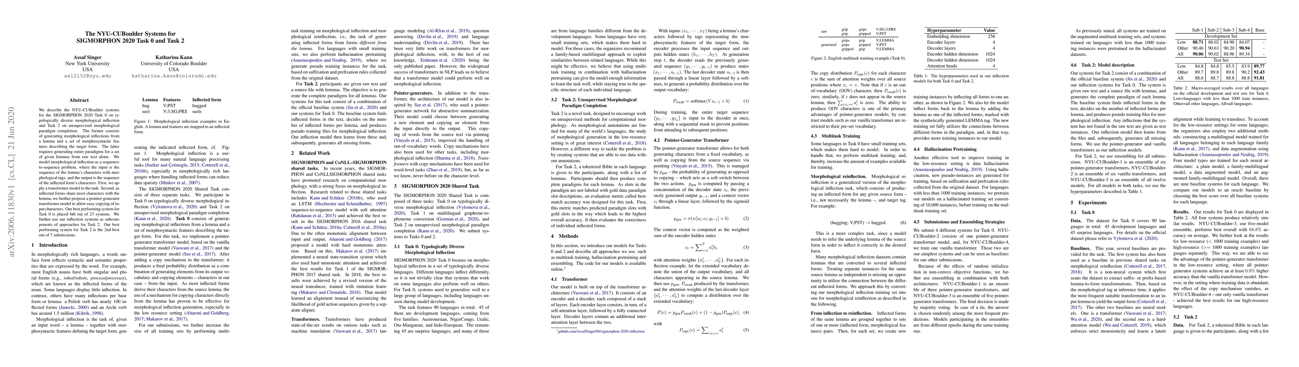 The NYU-CUBoulder systems tackle SIGMORPHON 2020's Task 0 on morphological inflection and Task 2 on unsupervised paradigm completion using transformer models, with a pointer-generator variant for efficient character copying, achieving 6th and 2nd place respectively.