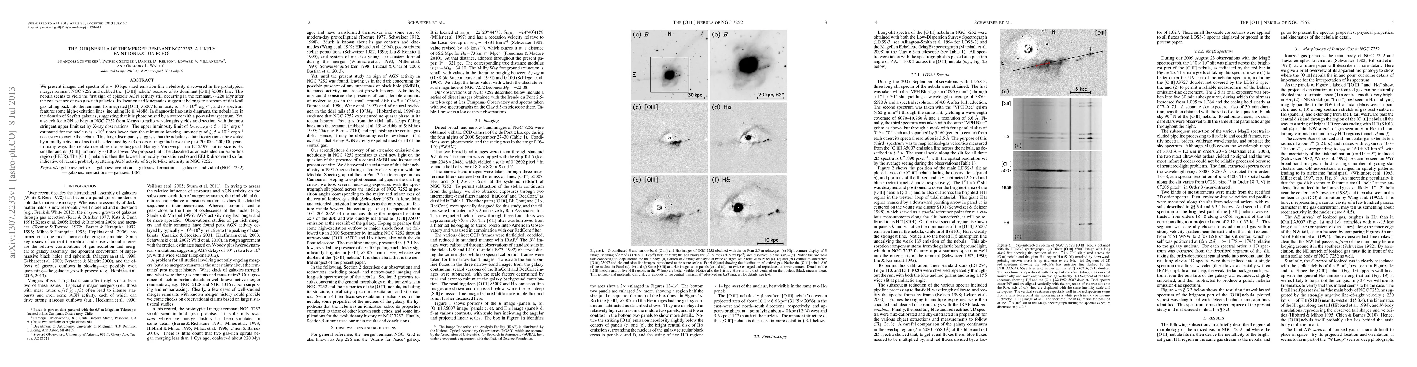 The [O III] nebula in NGC 7252, a merger remnant, shows signs of episodic AGN activity, likely as a faint ionization echo from a mildly active nucleus. The nebula's low luminosity suggests it is not currently powered by an active galactic nucleus, but rather reflects past activity.